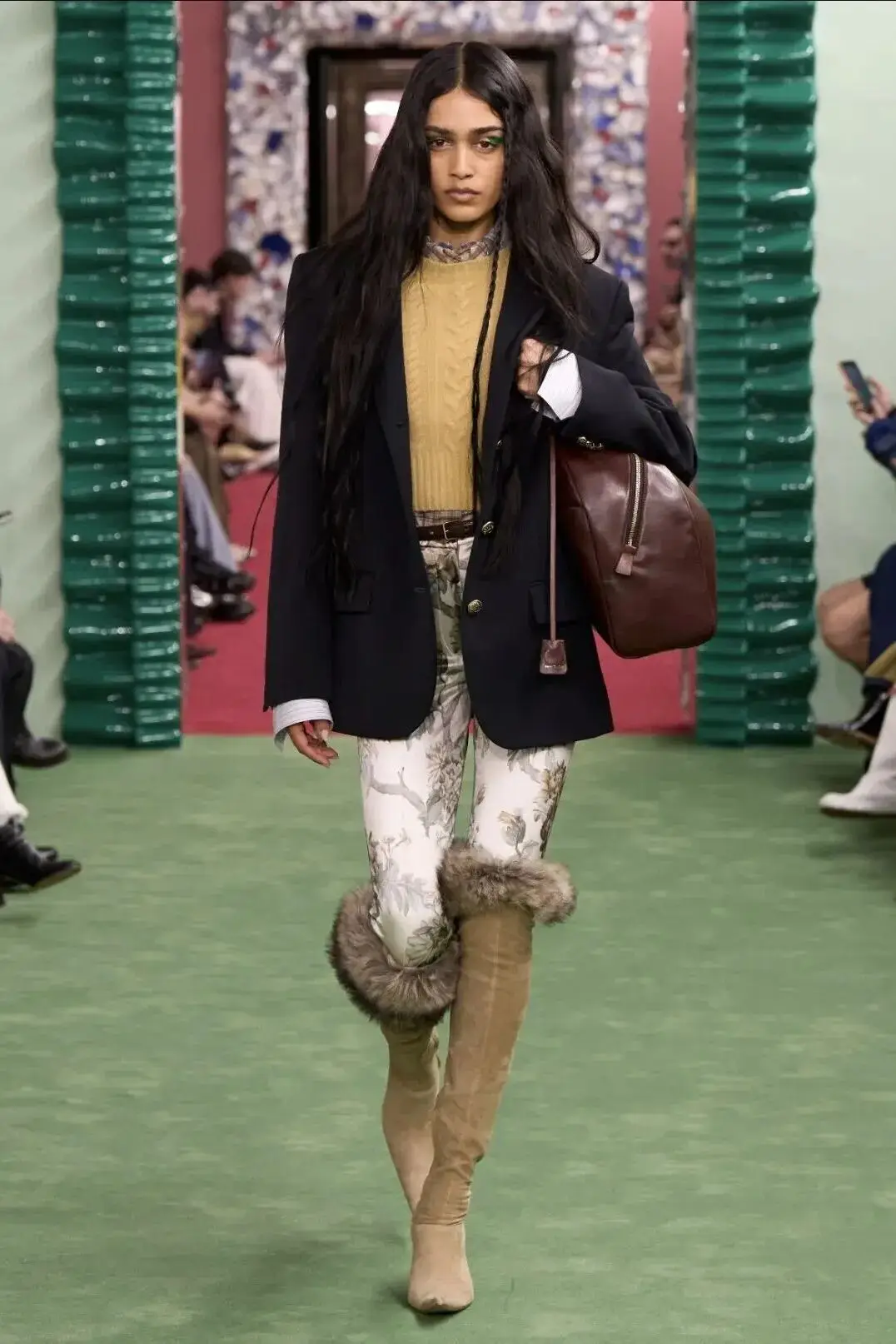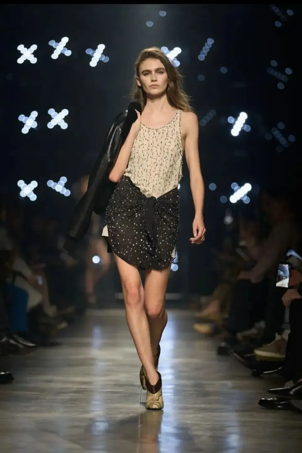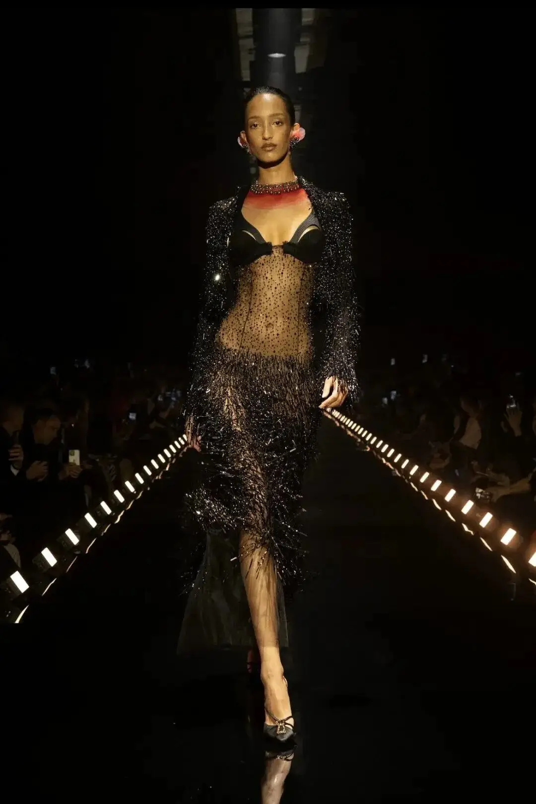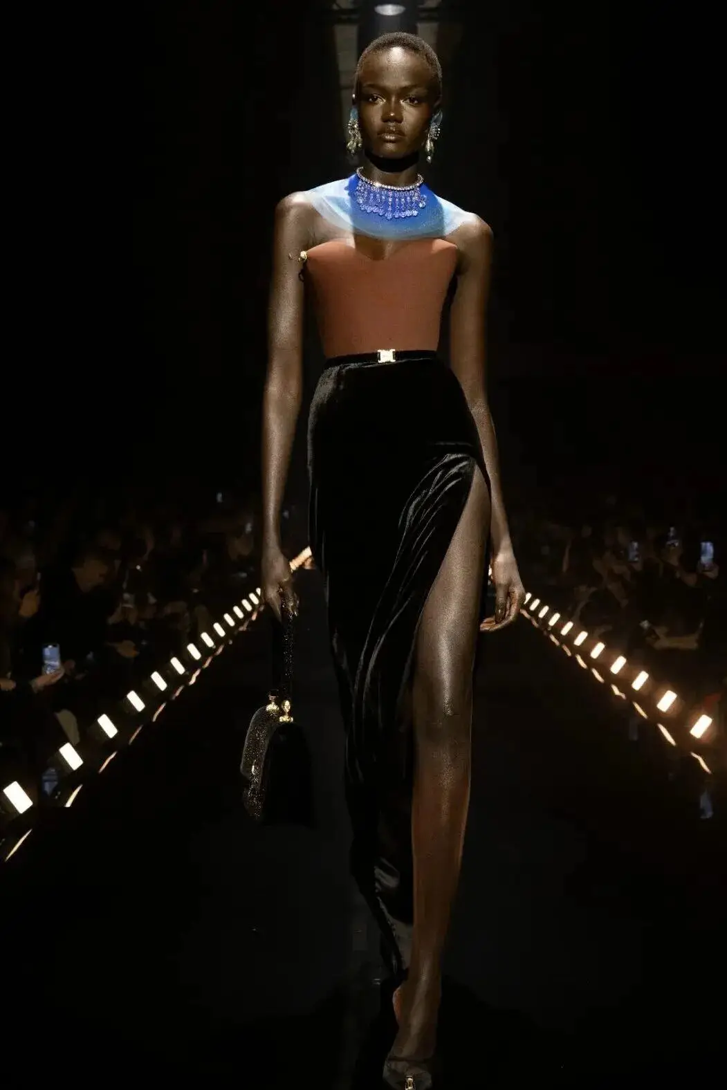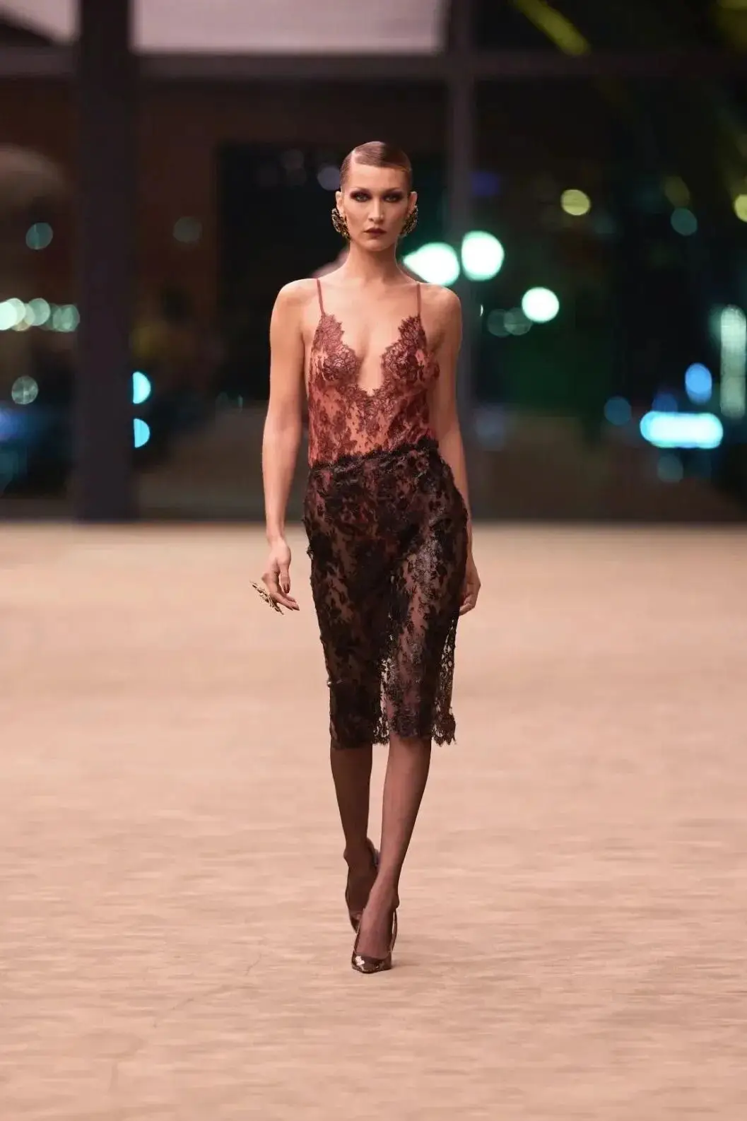 这也是Vaccarello最擅长的叙事方式:Vaccarello本季的灵感来自法国演员Romy Schneider在1971年电影《Max et les Ferrailleurs》中的形象,模特以极其明确的Saint Laurent女性形象登场:侧分发线、湿发质感的低发髻、深色唇妆和烟熏眼影。因此整场秀呈现出一种介于优雅与脆弱之间的情绪张力。