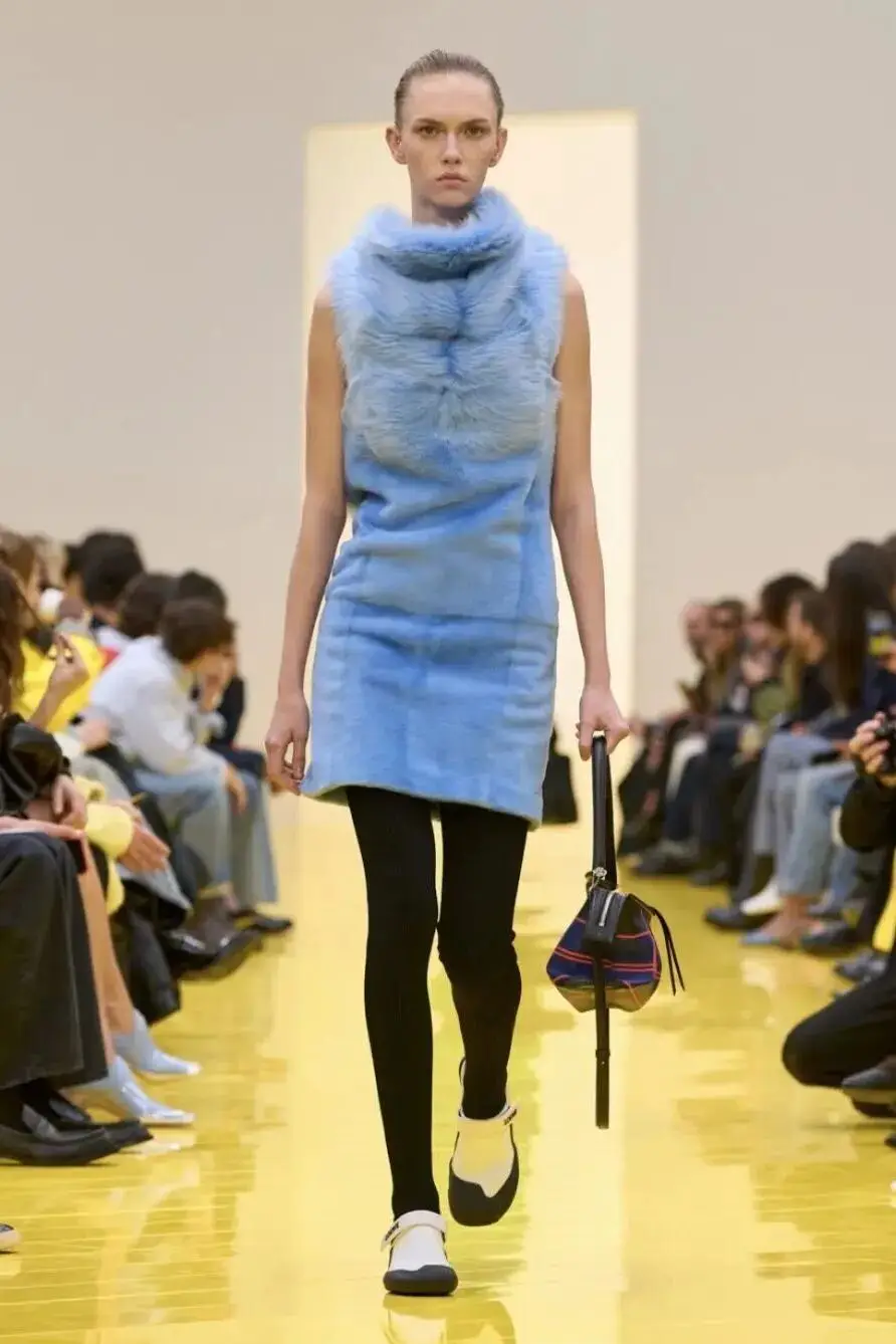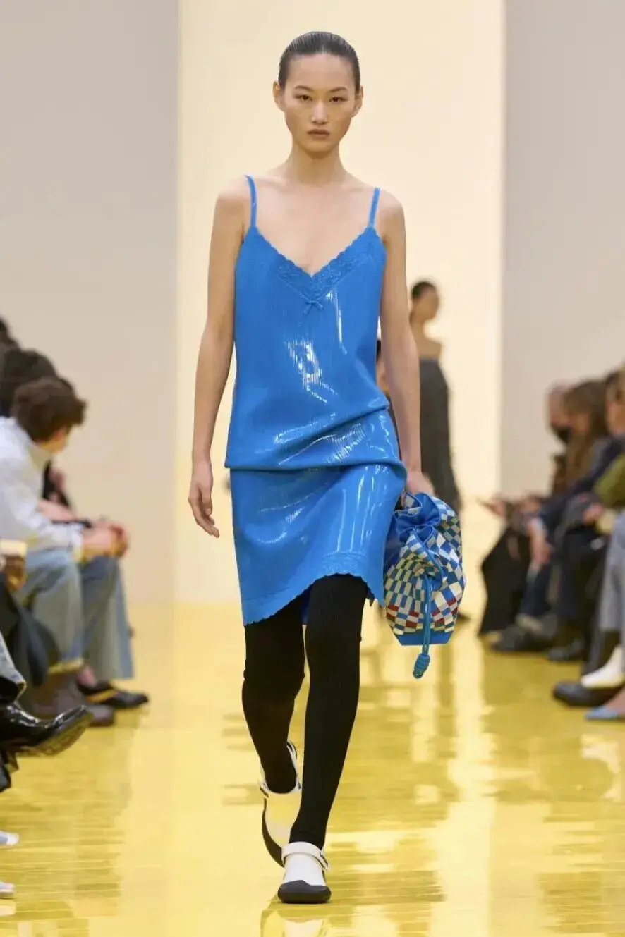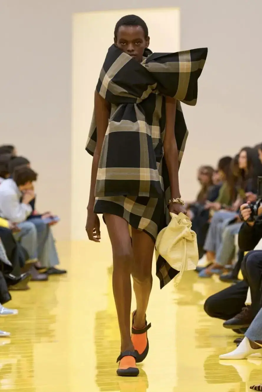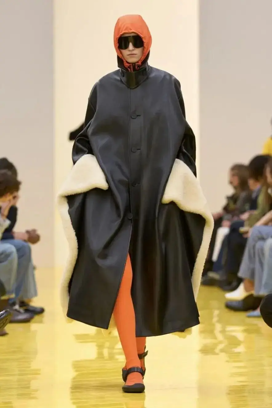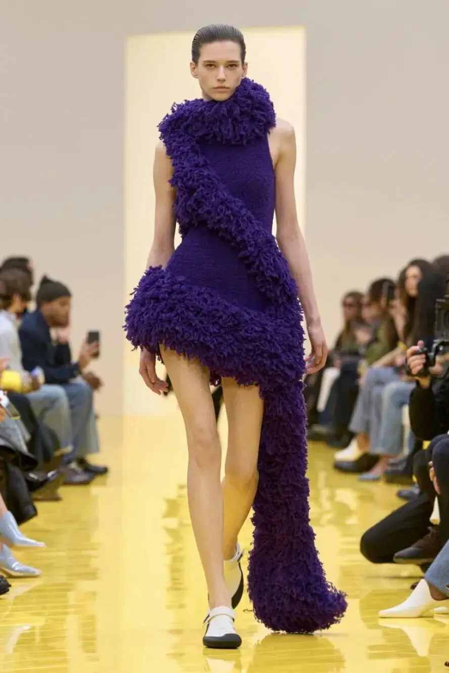 恰逢Lanvin男装诞生百年,Copping亦将男装结构引入女装语言。羊毛、法兰绒与麦尔登呢塑造出挺括的外套与西装轮廓,而衬衫与礼服则通过褶裥、省道与抽褶重新贴合身体曲线,在刚毅与柔美之间建立新的节奏。品牌经典的robe de style 廓形亦被重新唤醒——体量感裙摆在羊毛与真丝之间展开,随着步伐轻轻摆动,既保留历史比例,也显得更加轻松而现代。