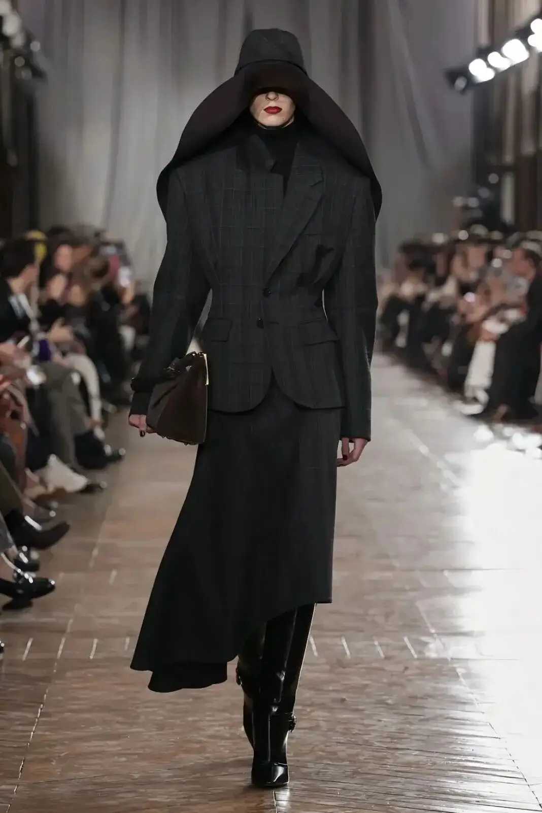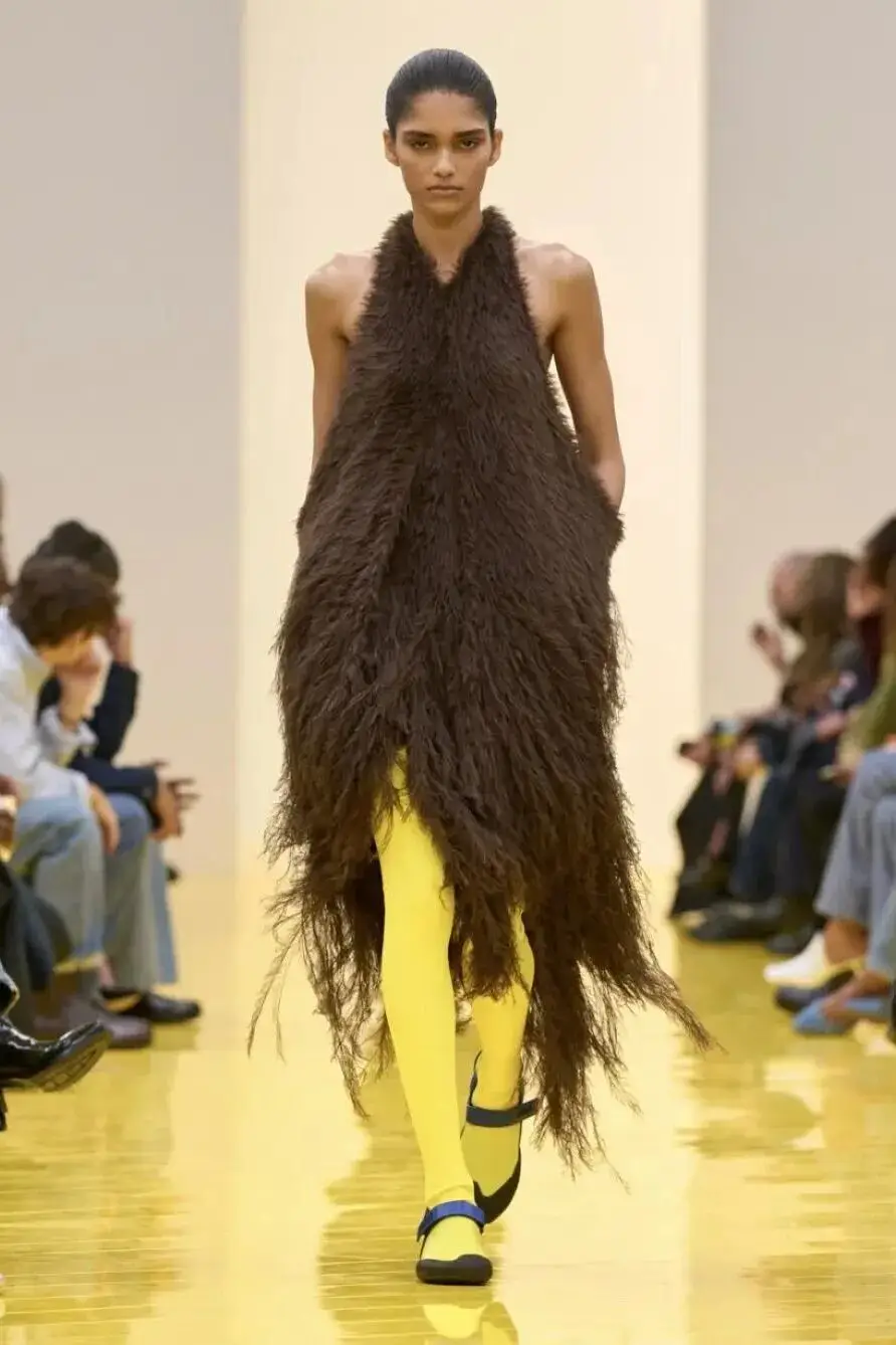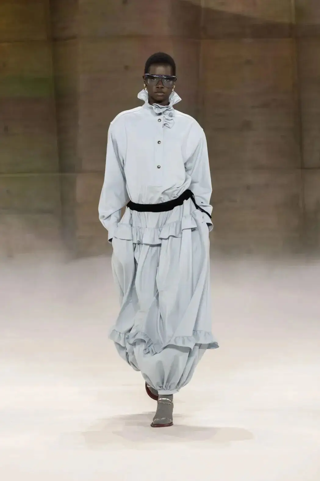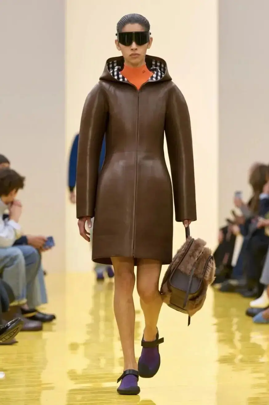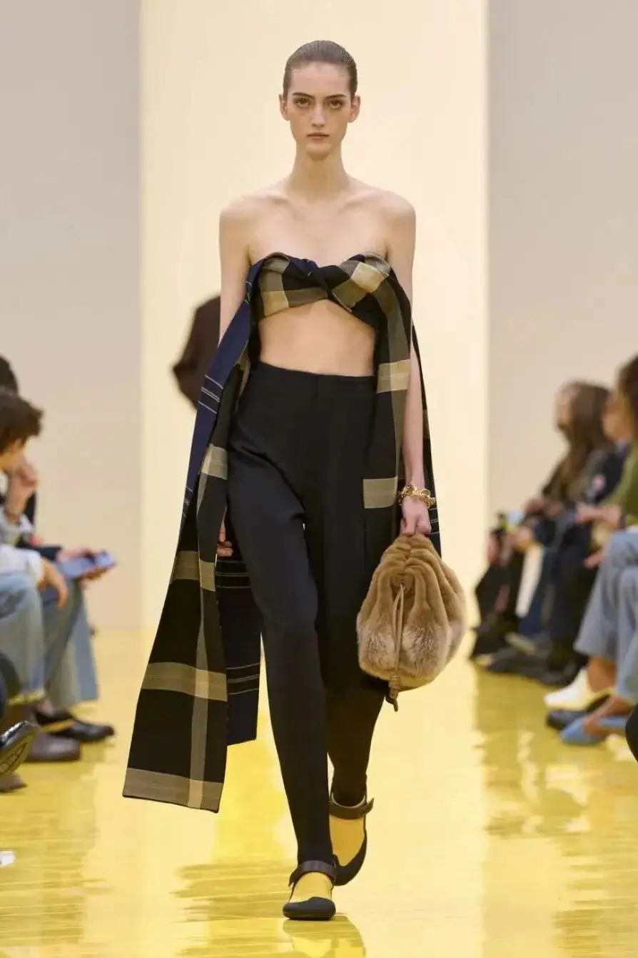 恰逢Lanvin男装诞生百年,Copping亦将男装结构引入女装语言。羊毛、法兰绒与麦尔登呢塑造出挺括的外套与西装轮廓,而衬衫与礼服则通过褶裥、省道与抽褶重新贴合身体曲线,在刚毅与柔美之间建立新的节奏。品牌经典的robe de style 廓形亦被重新唤醒——体量感裙摆在羊毛与真丝之间展开,随着步伐轻轻摆动,既保留历史比例,也显得更加轻松而现代。