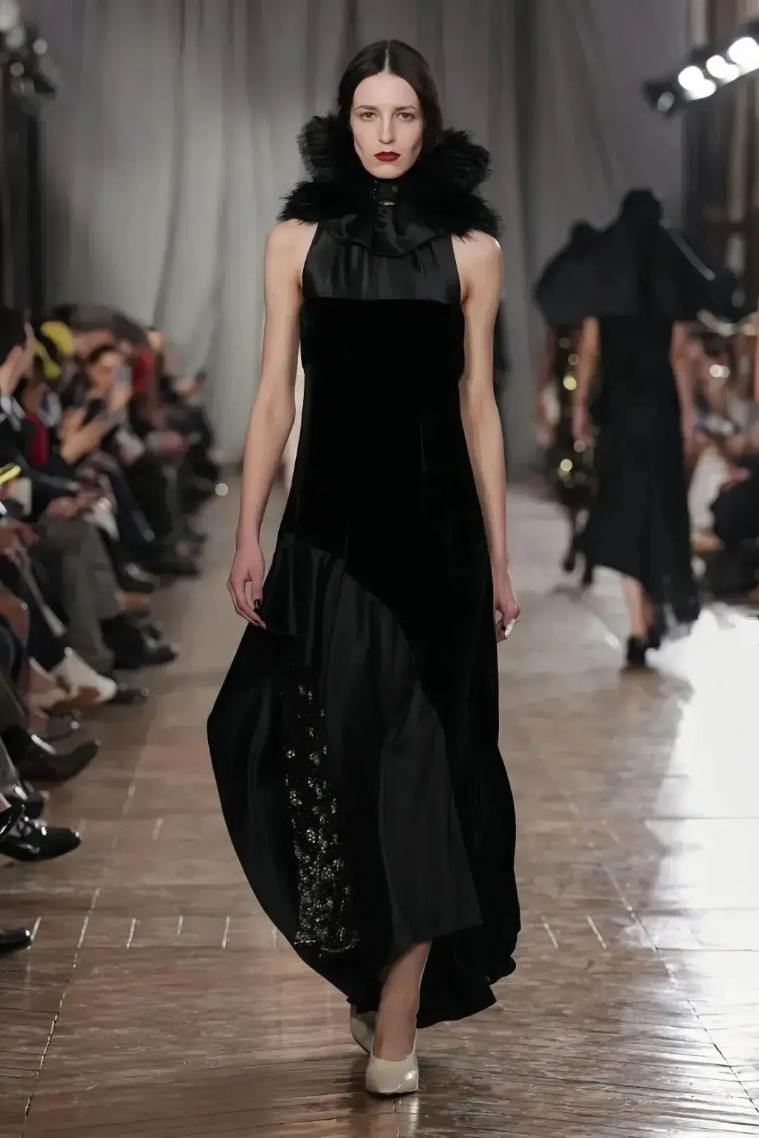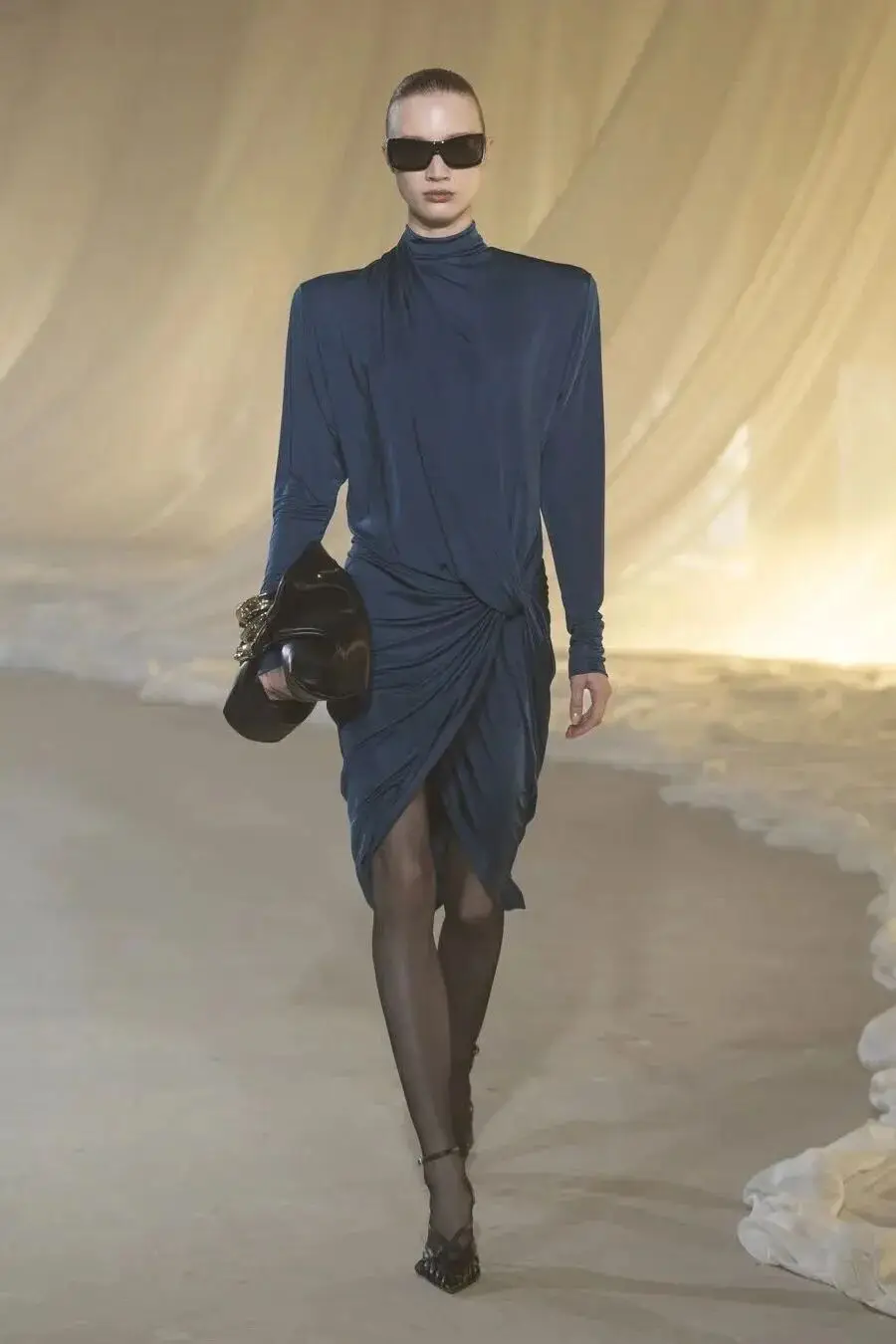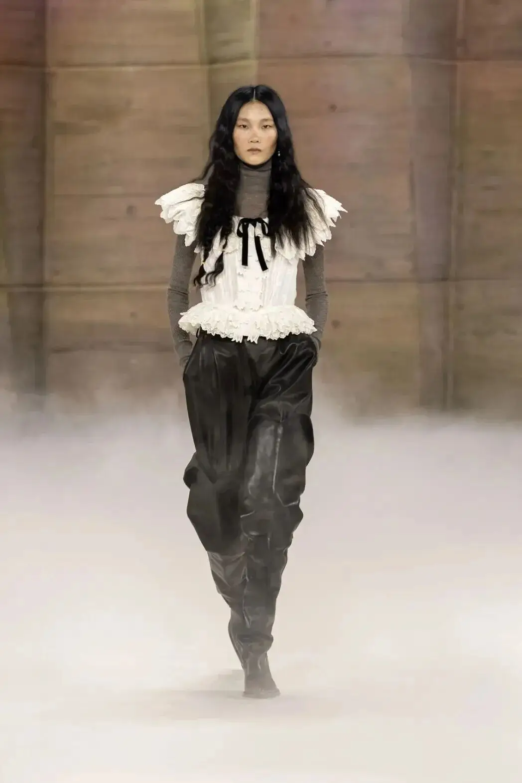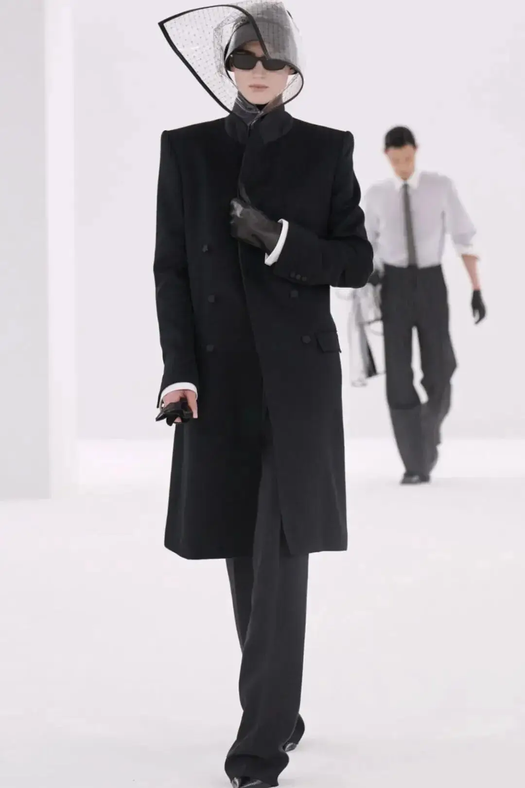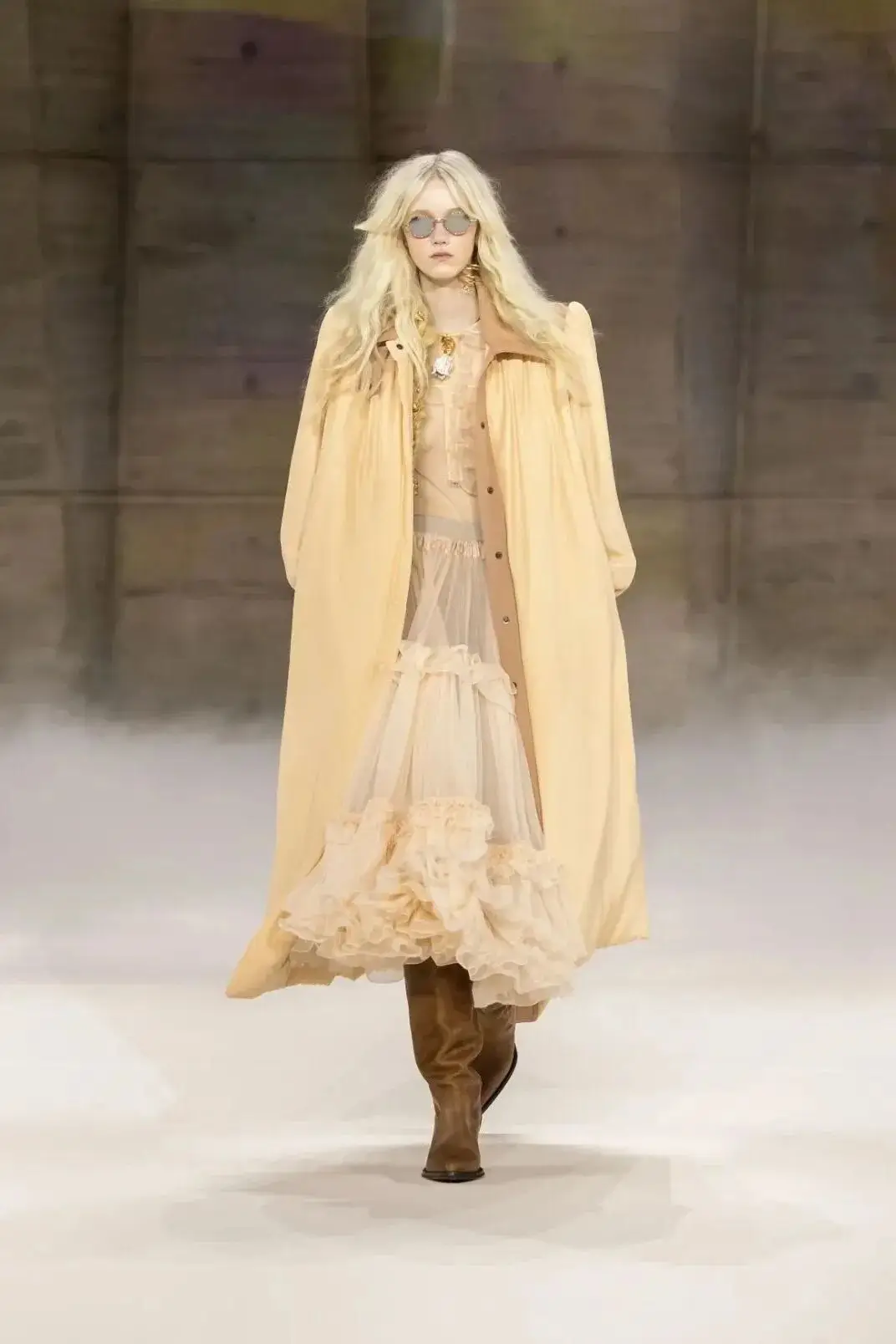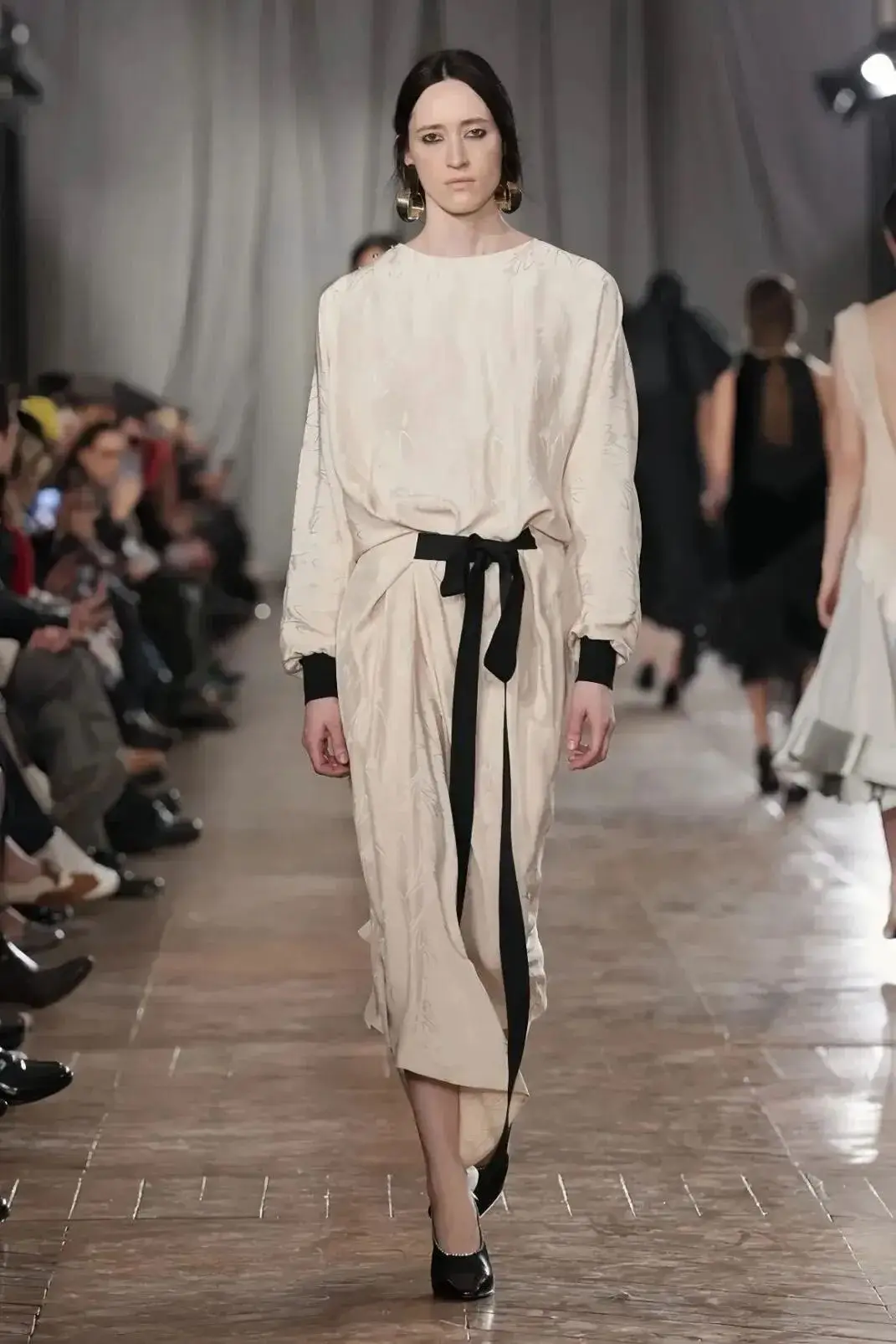 恰逢Lanvin男装诞生百年,Copping亦将男装结构引入女装语言。羊毛、法兰绒与麦尔登呢塑造出挺括的外套与西装轮廓,而衬衫与礼服则通过褶裥、省道与抽褶重新贴合身体曲线,在刚毅与柔美之间建立新的节奏。品牌经典的robe de style 廓形亦被重新唤醒——体量感裙摆在羊毛与真丝之间展开,随着步伐轻轻摆动,既保留历史比例,也显得更加轻松而现代。