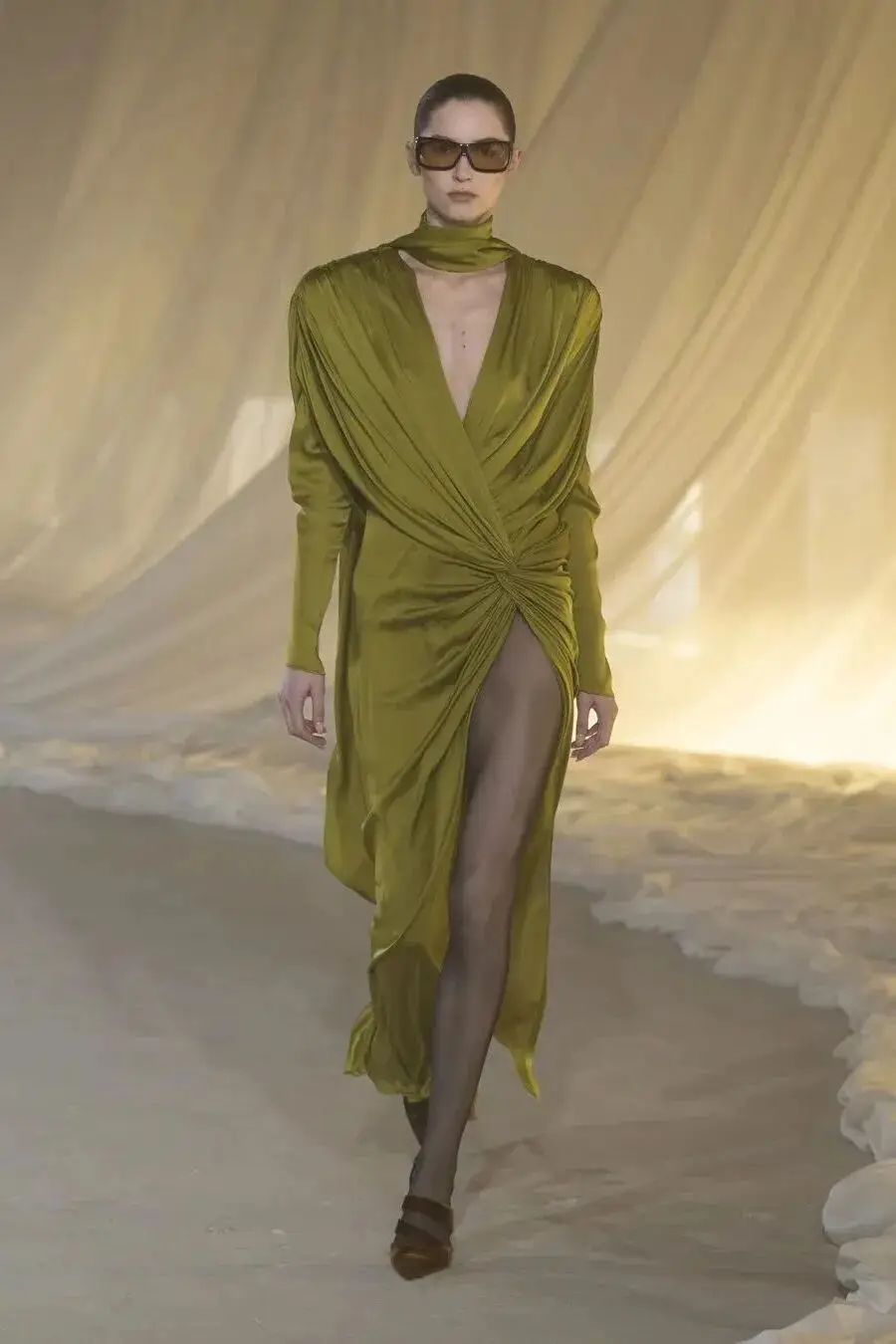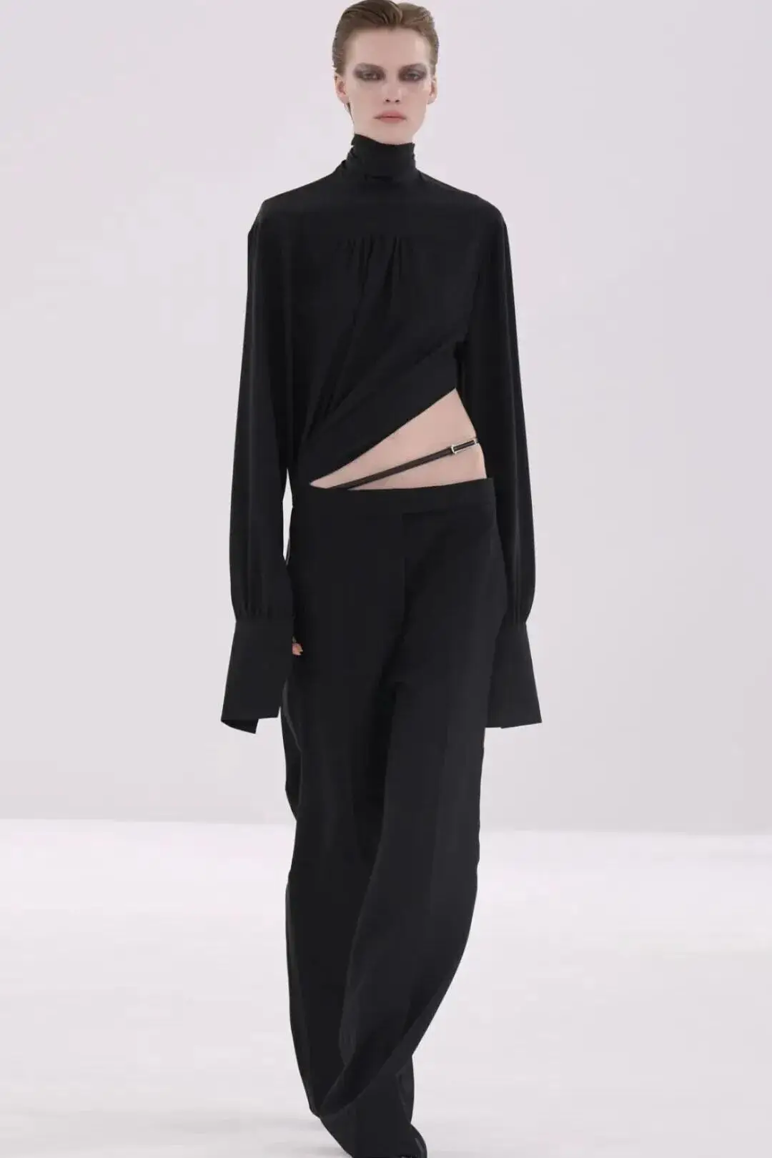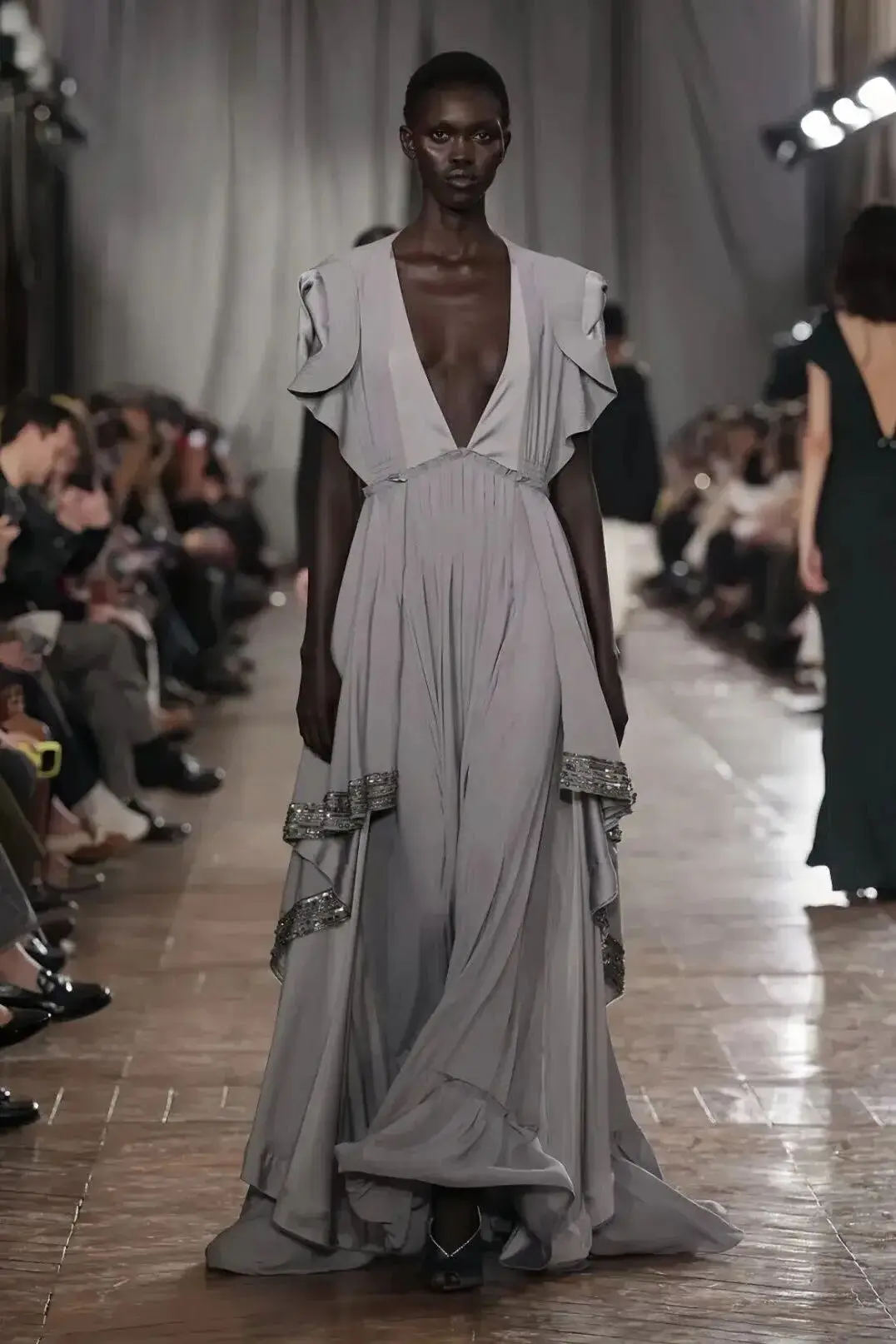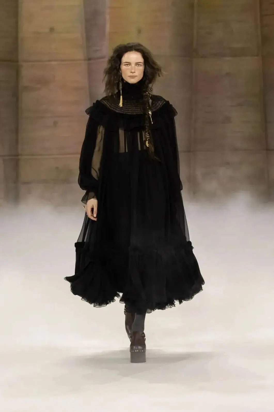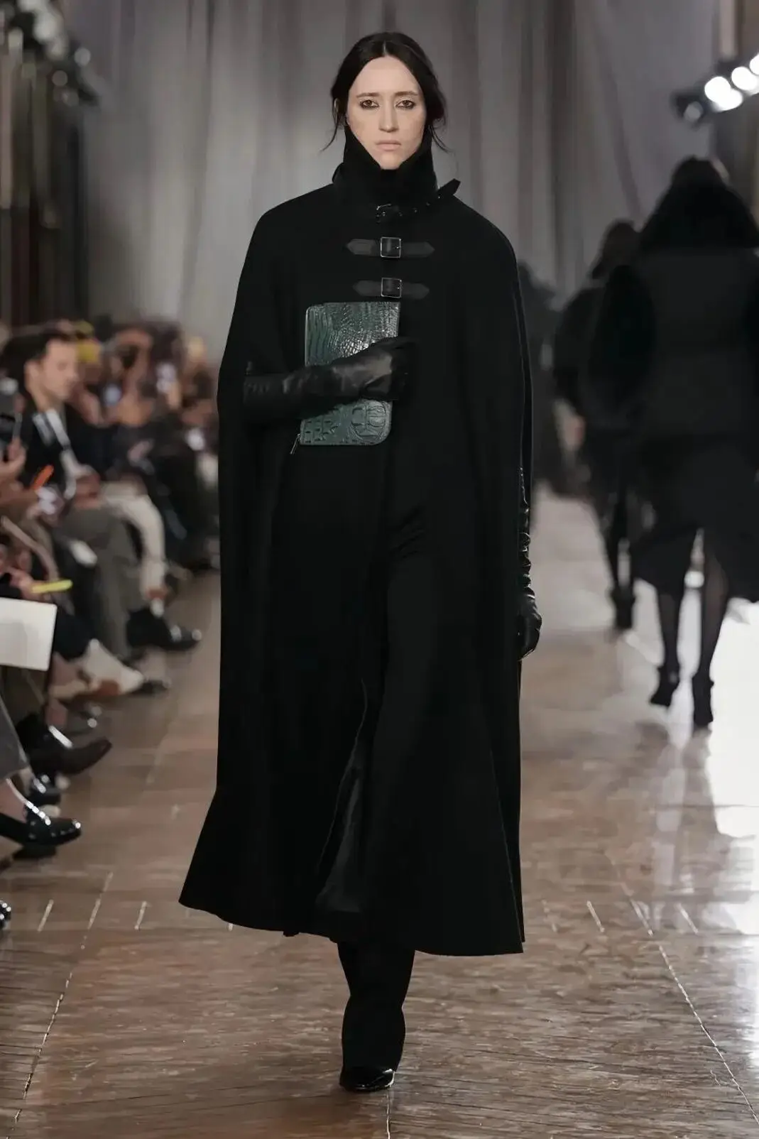 恰逢Lanvin男装诞生百年,Copping亦将男装结构引入女装语言。羊毛、法兰绒与麦尔登呢塑造出挺括的外套与西装轮廓,而衬衫与礼服则通过褶裥、省道与抽褶重新贴合身体曲线,在刚毅与柔美之间建立新的节奏。品牌经典的robe de style 廓形亦被重新唤醒——体量感裙摆在羊毛与真丝之间展开,随着步伐轻轻摆动,既保留历史比例,也显得更加轻松而现代。