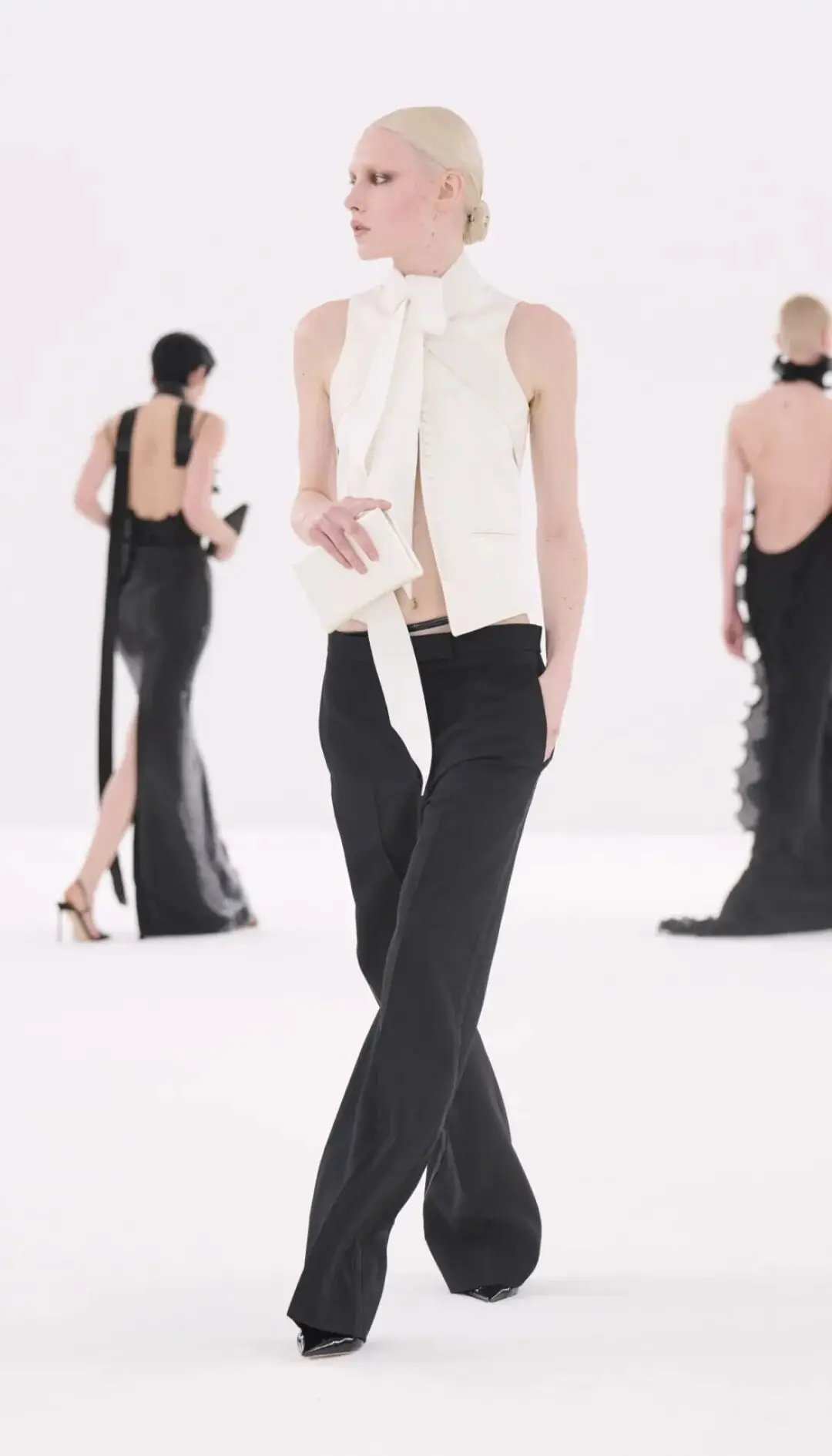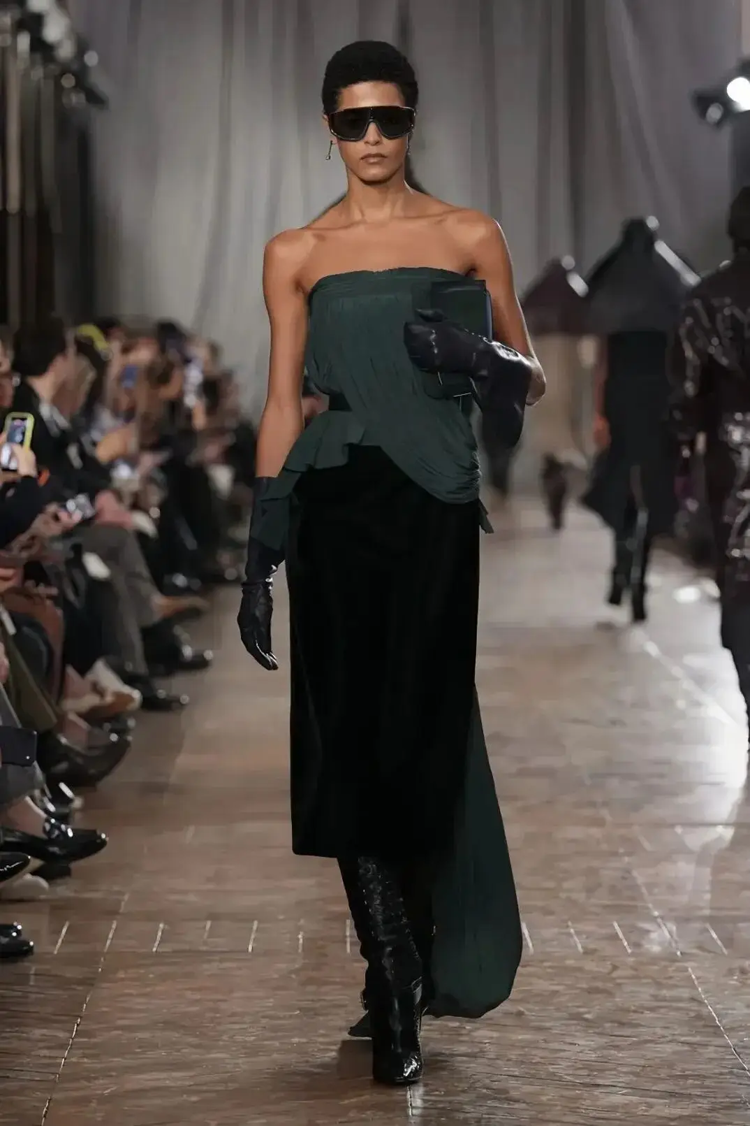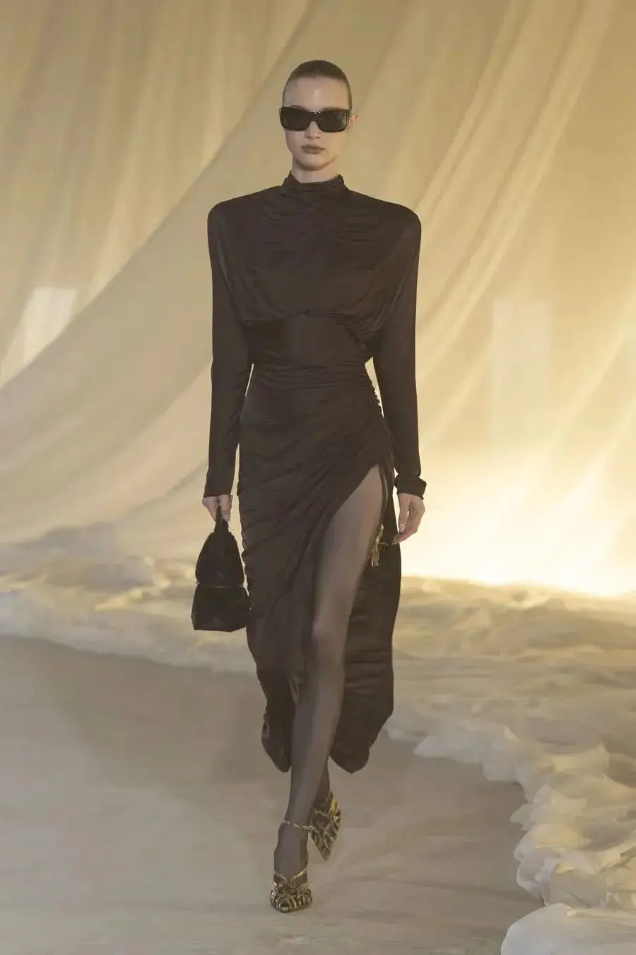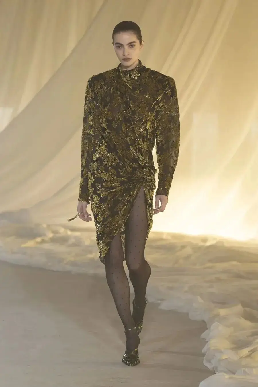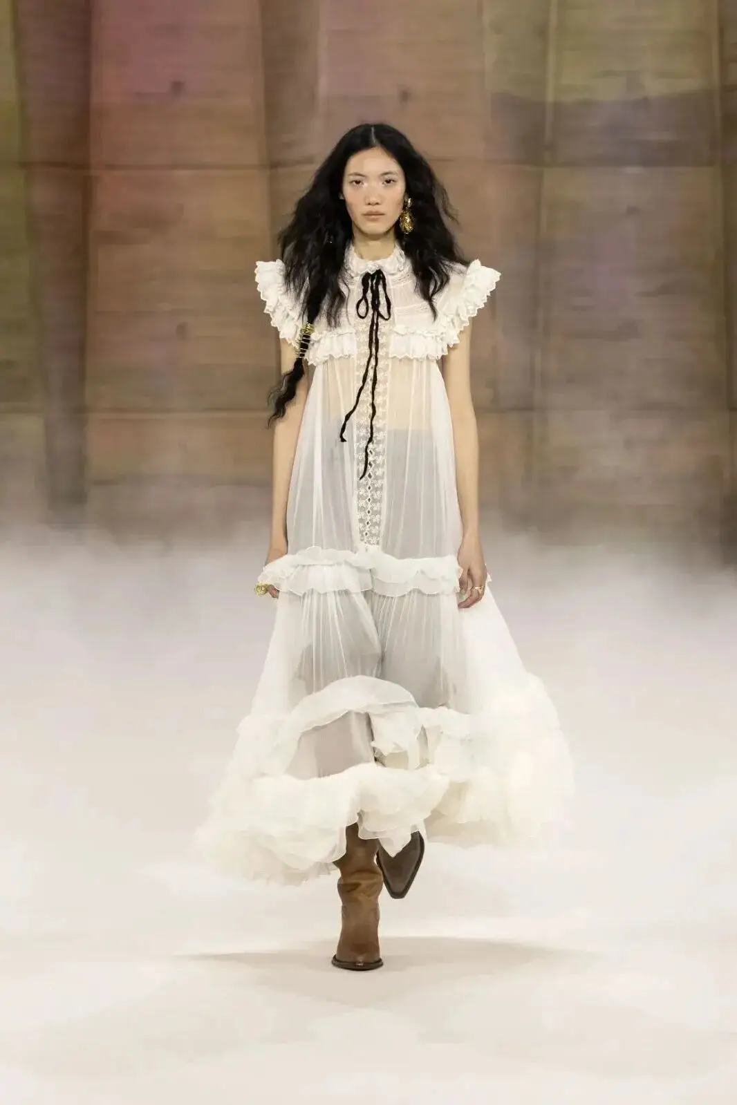 恰逢Lanvin男装诞生百年,Copping亦将男装结构引入女装语言。羊毛、法兰绒与麦尔登呢塑造出挺括的外套与西装轮廓,而衬衫与礼服则通过褶裥、省道与抽褶重新贴合身体曲线,在刚毅与柔美之间建立新的节奏。品牌经典的robe de style 廓形亦被重新唤醒——体量感裙摆在羊毛与真丝之间展开,随着步伐轻轻摆动,既保留历史比例,也显得更加轻松而现代。