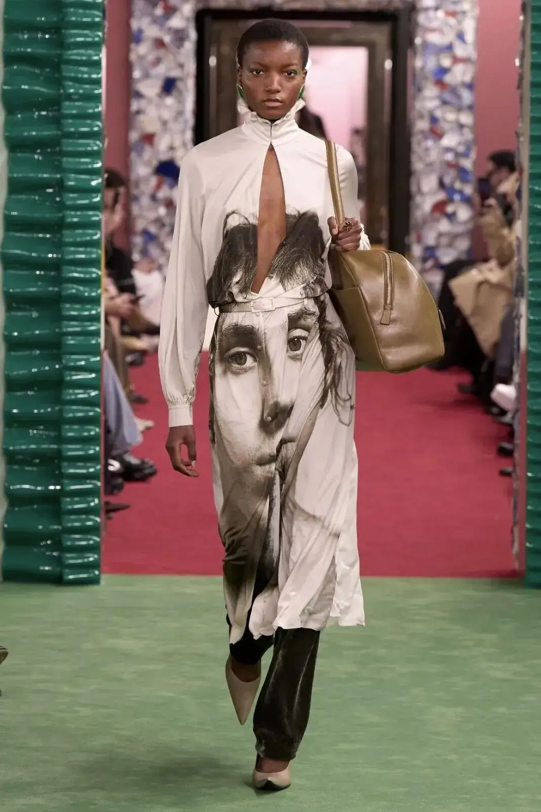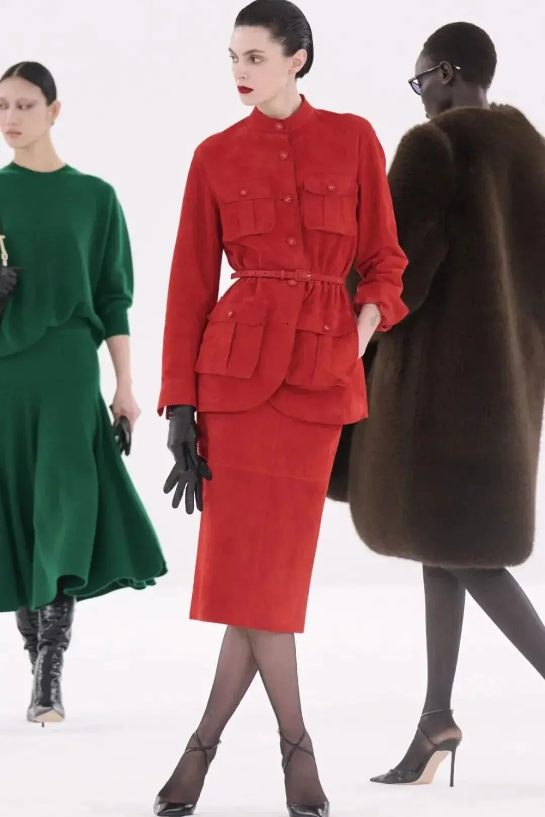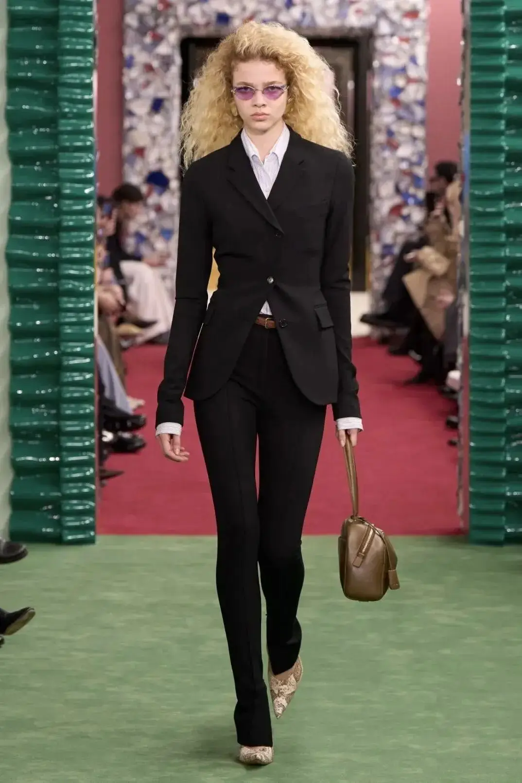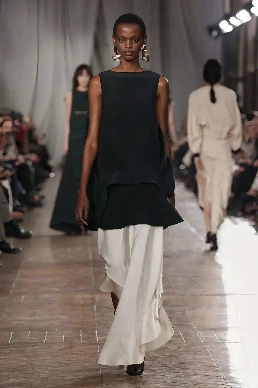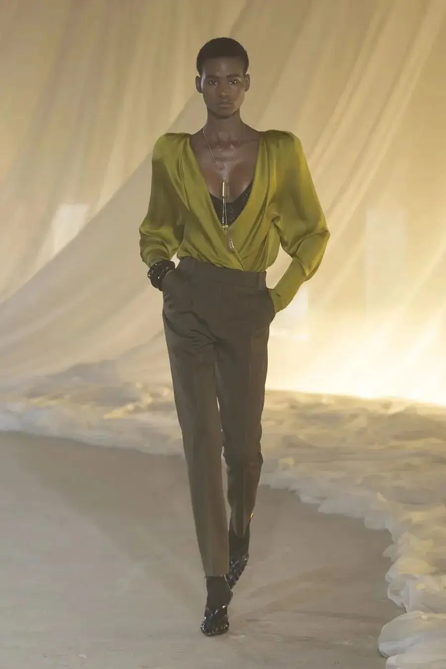 恰逢Lanvin男装诞生百年,Copping亦将男装结构引入女装语言。羊毛、法兰绒与麦尔登呢塑造出挺括的外套与西装轮廓,而衬衫与礼服则通过褶裥、省道与抽褶重新贴合身体曲线,在刚毅与柔美之间建立新的节奏。品牌经典的robe de style 廓形亦被重新唤醒——体量感裙摆在羊毛与真丝之间展开,随着步伐轻轻摆动,既保留历史比例,也显得更加轻松而现代。