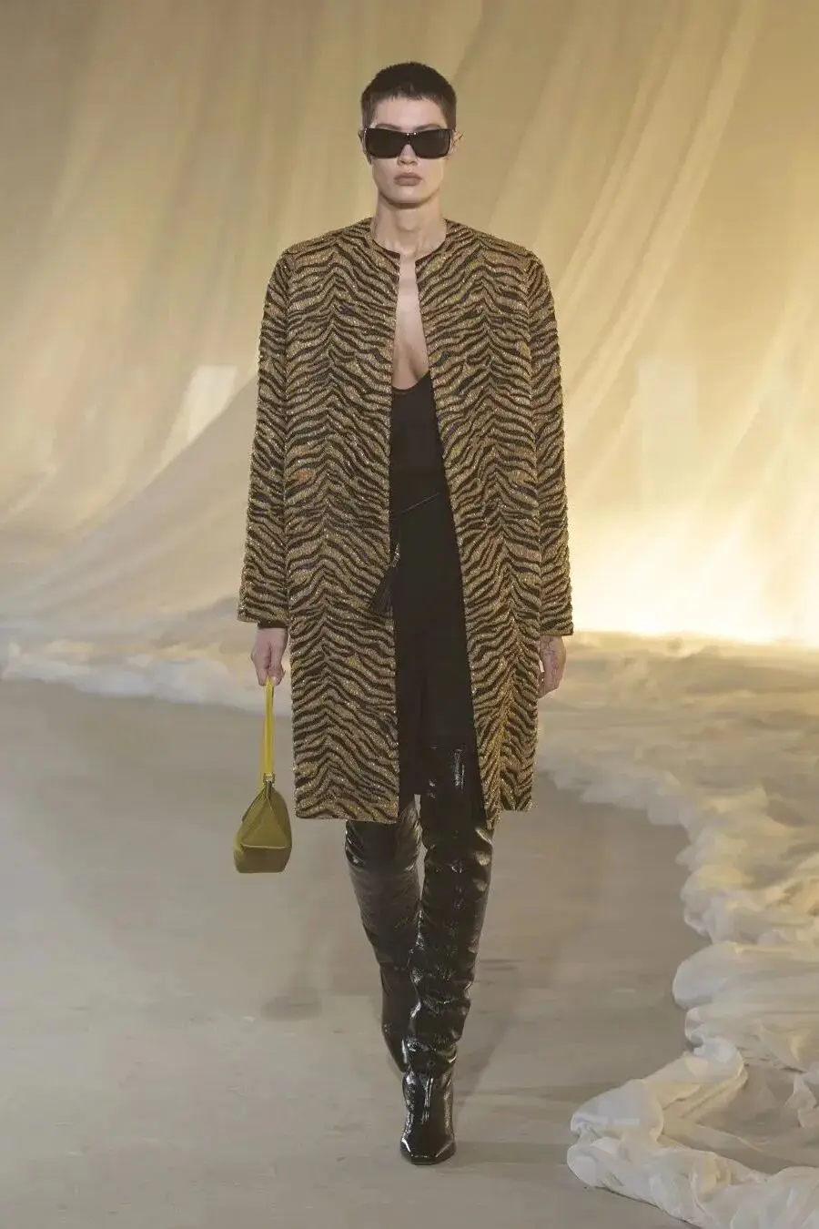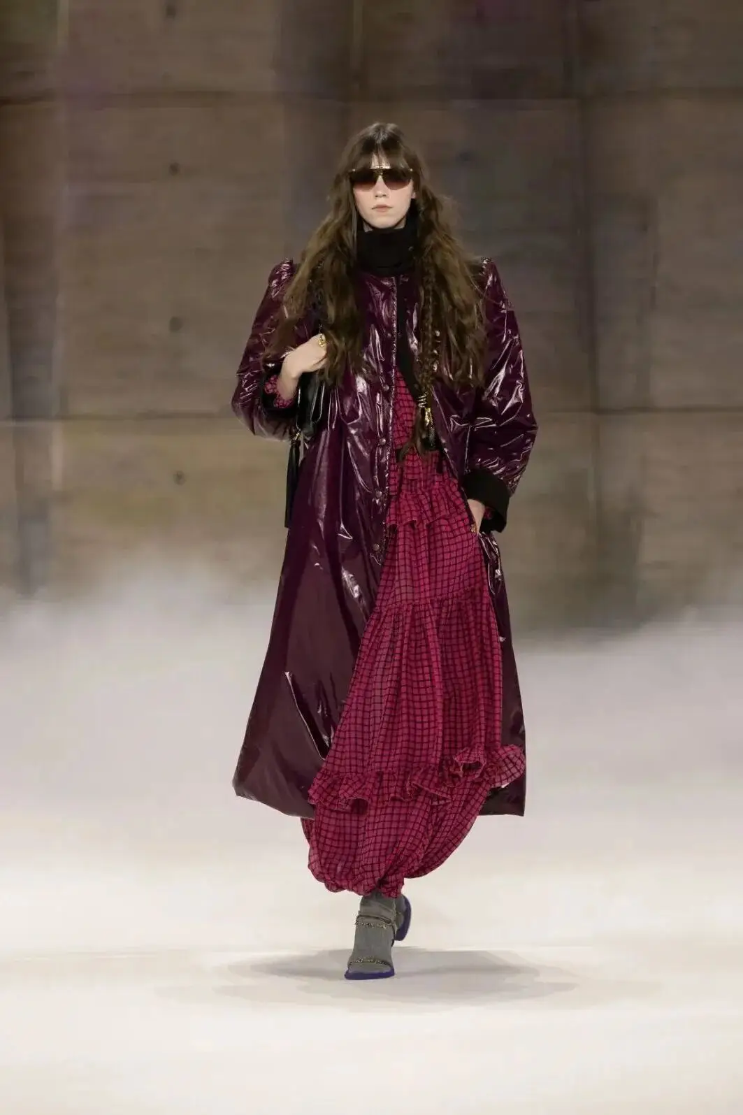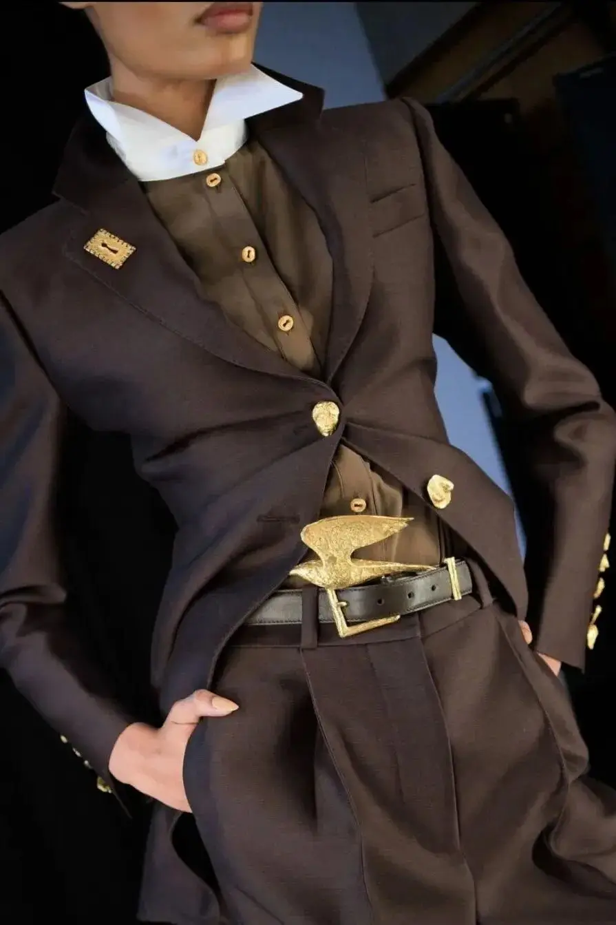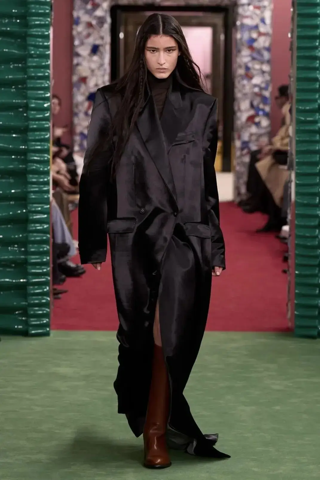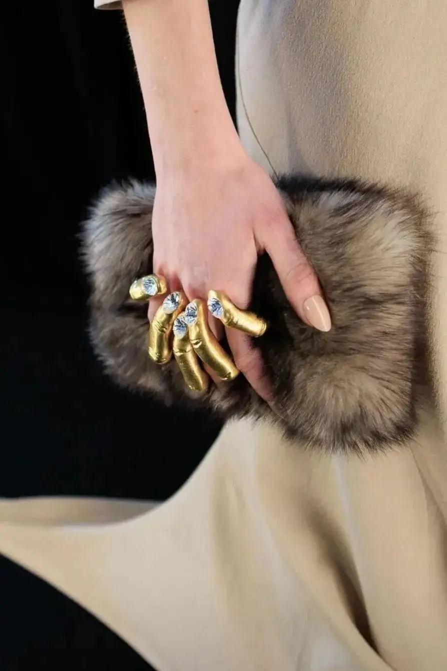 恰逢Lanvin男装诞生百年,Copping亦将男装结构引入女装语言。羊毛、法兰绒与麦尔登呢塑造出挺括的外套与西装轮廓,而衬衫与礼服则通过褶裥、省道与抽褶重新贴合身体曲线,在刚毅与柔美之间建立新的节奏。品牌经典的robe de style 廓形亦被重新唤醒——体量感裙摆在羊毛与真丝之间展开,随着步伐轻轻摆动,既保留历史比例,也显得更加轻松而现代。