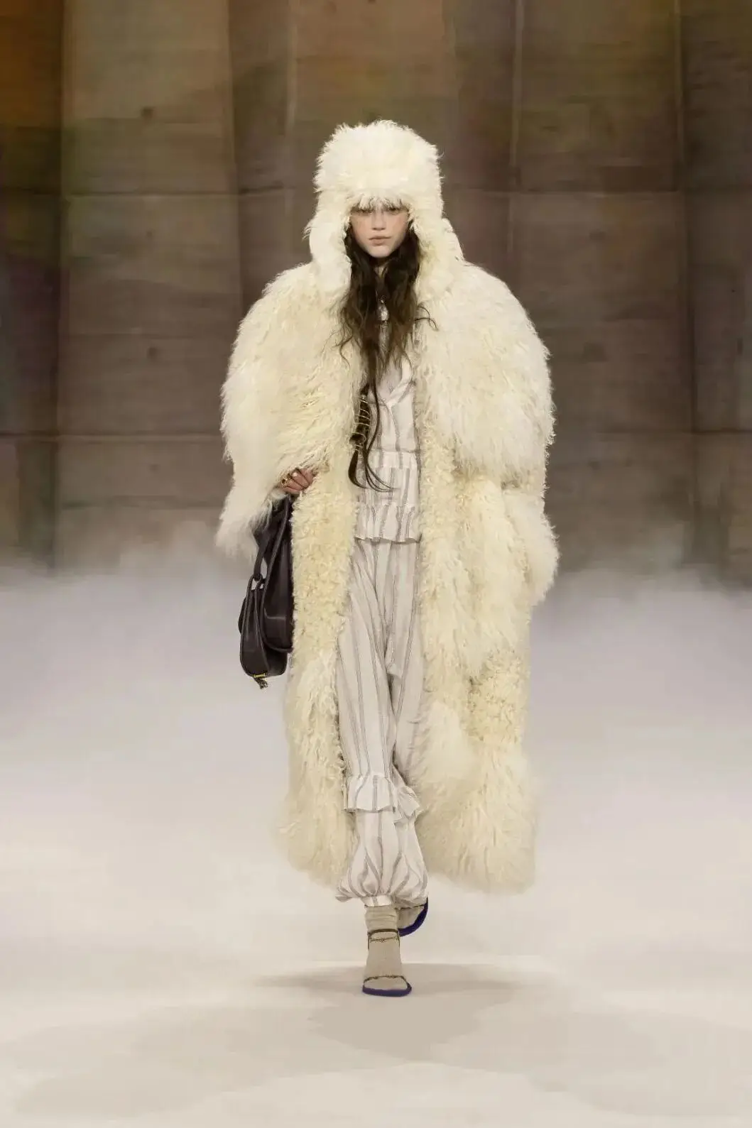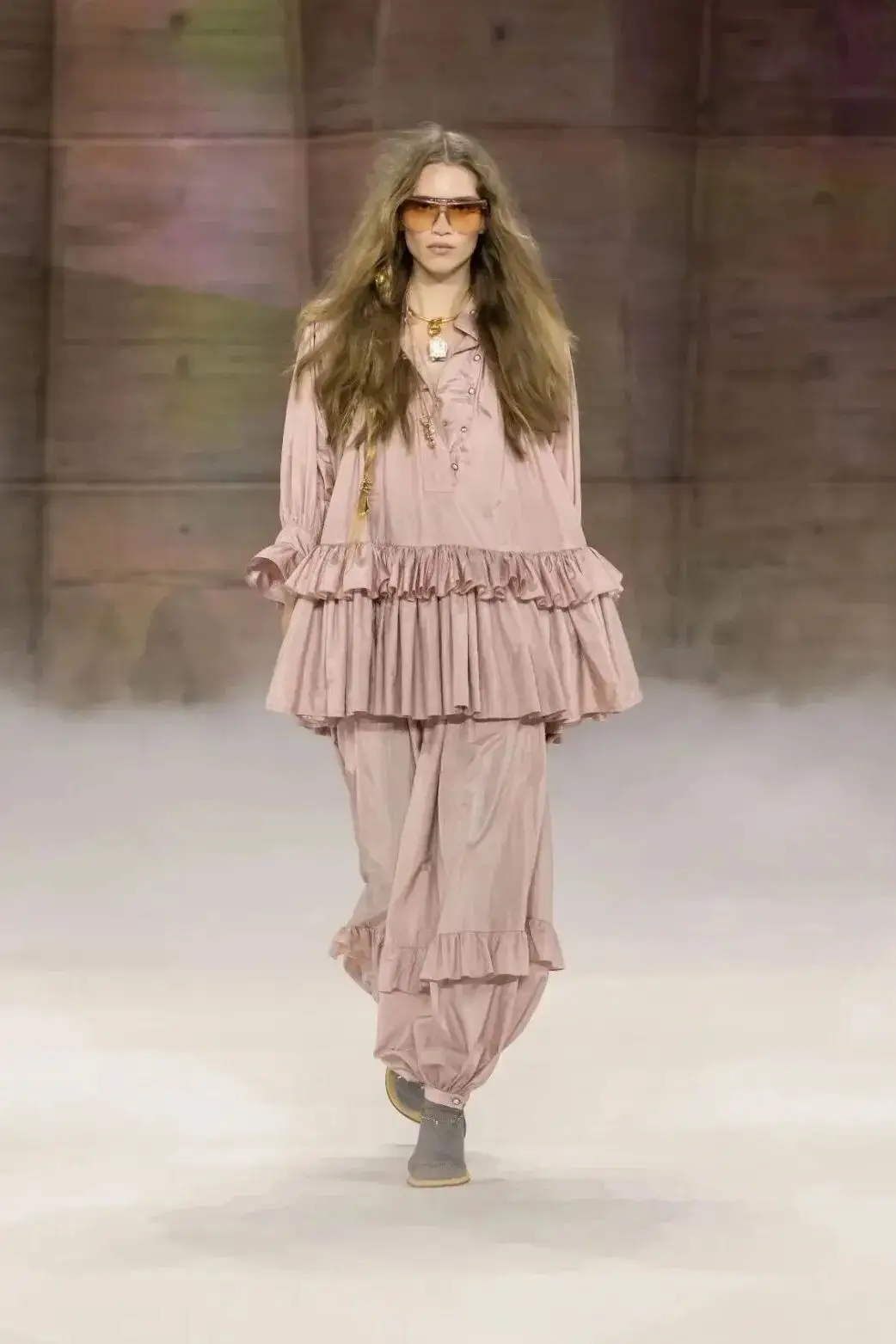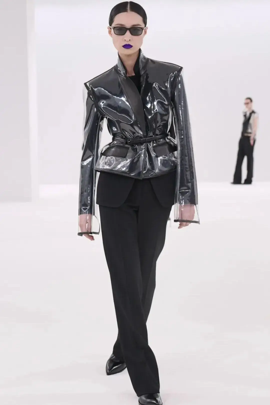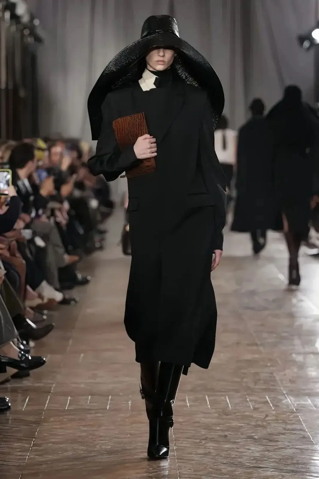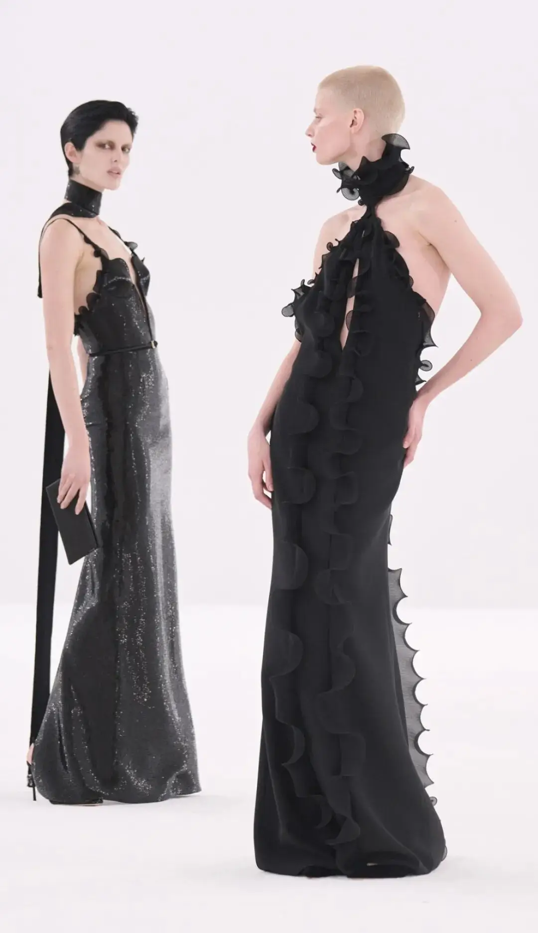 恰逢Lanvin男装诞生百年,Copping亦将男装结构引入女装语言。羊毛、法兰绒与麦尔登呢塑造出挺括的外套与西装轮廓,而衬衫与礼服则通过褶裥、省道与抽褶重新贴合身体曲线,在刚毅与柔美之间建立新的节奏。品牌经典的robe de style 廓形亦被重新唤醒——体量感裙摆在羊毛与真丝之间展开,随着步伐轻轻摆动,既保留历史比例,也显得更加轻松而现代。
