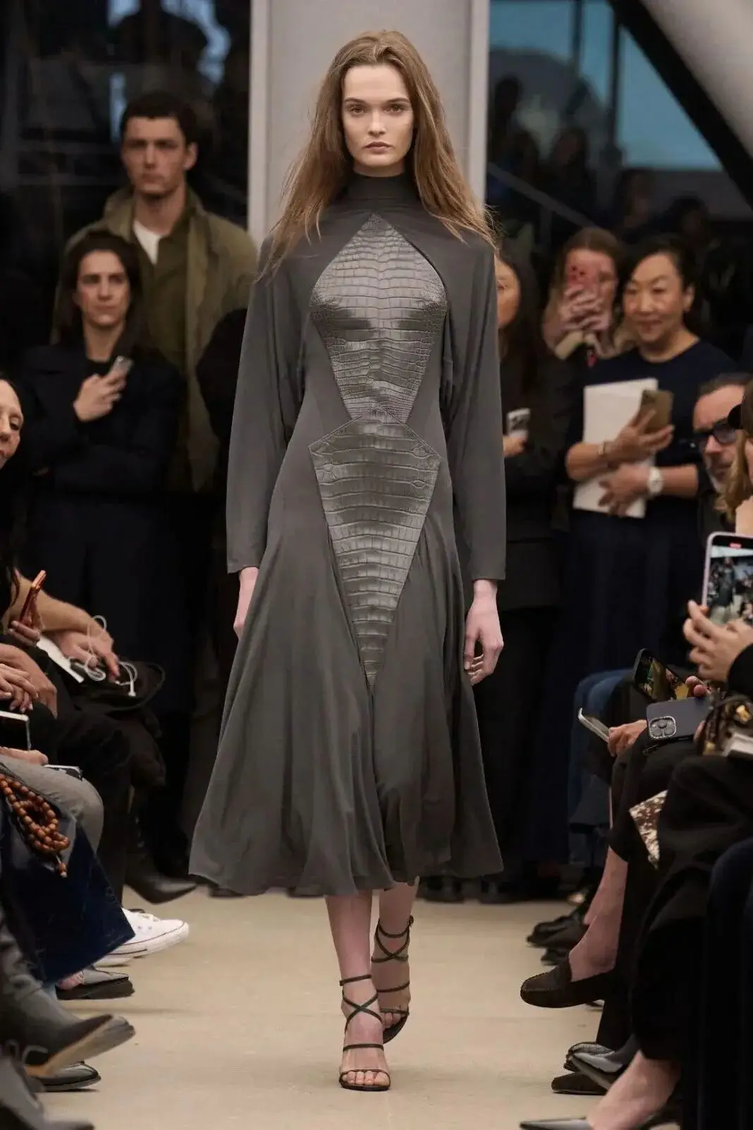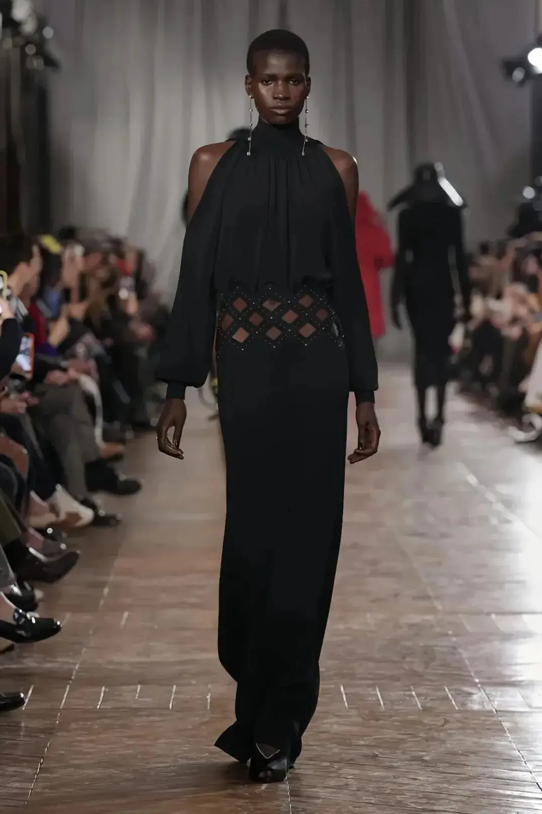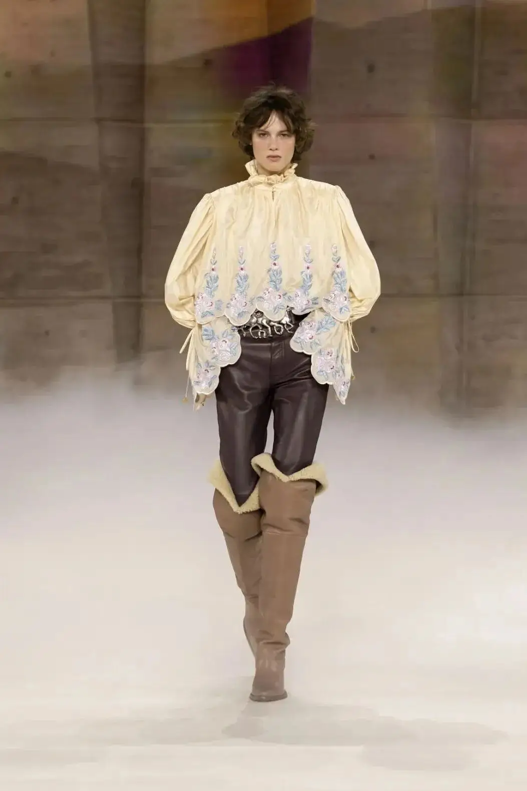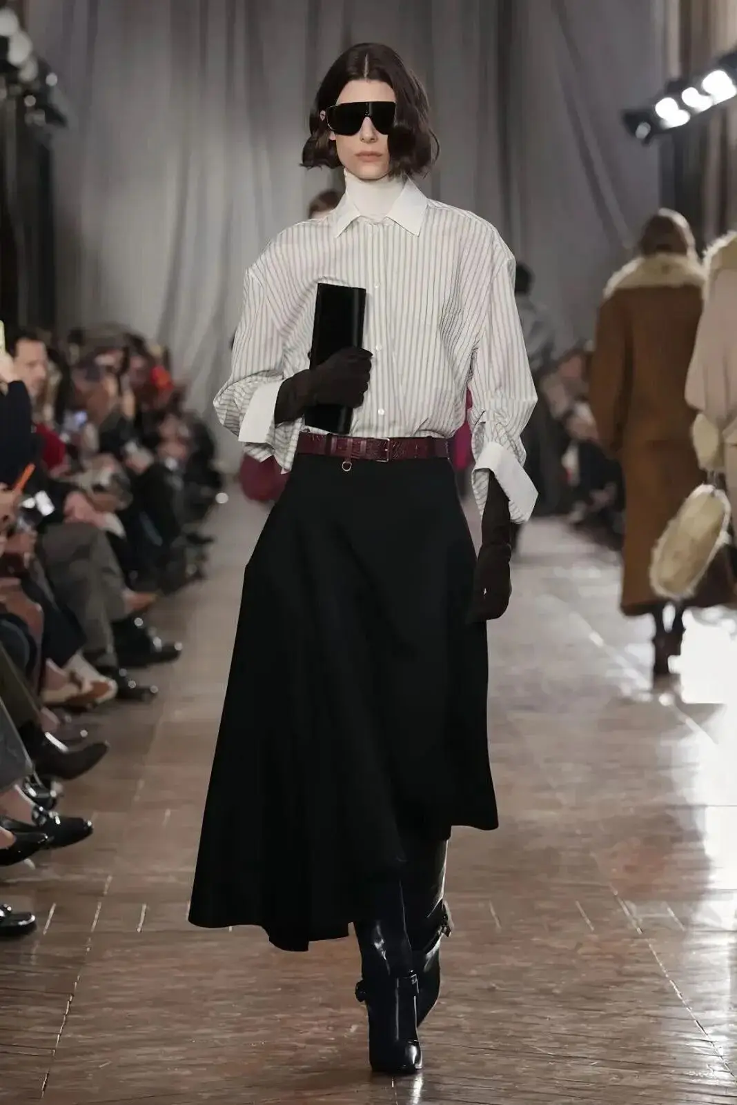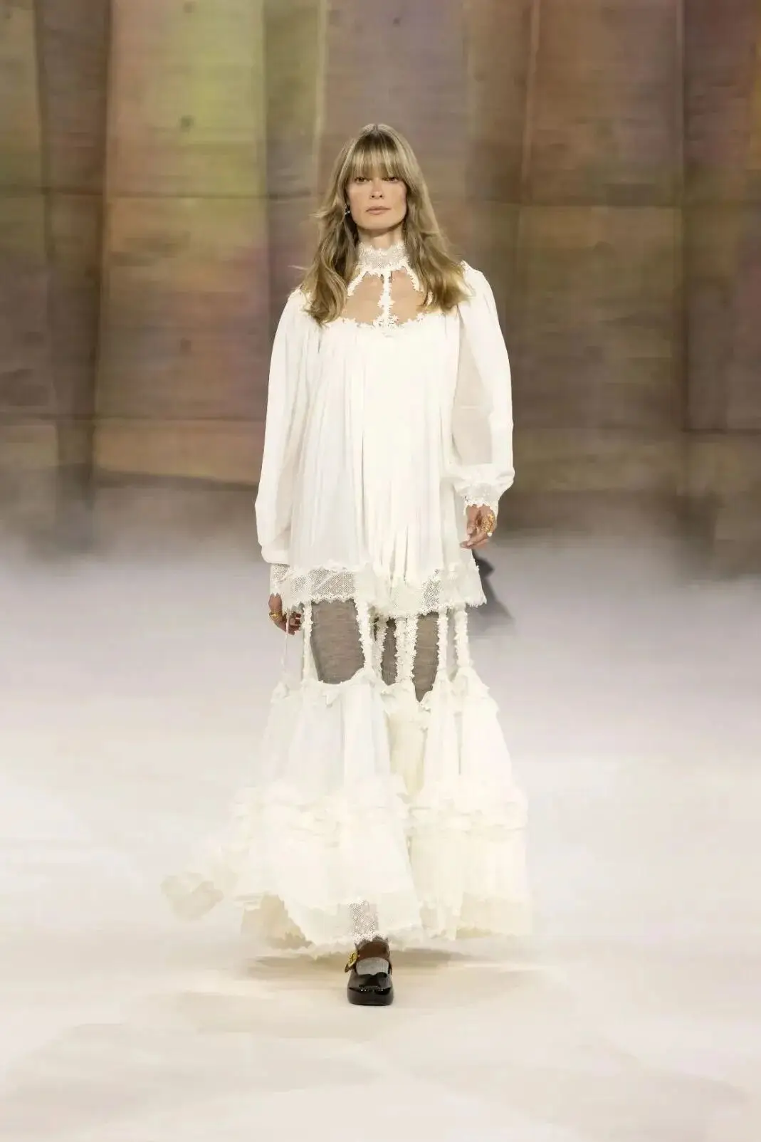 恰逢Lanvin男装诞生百年,Copping亦将男装结构引入女装语言。羊毛、法兰绒与麦尔登呢塑造出挺括的外套与西装轮廓,而衬衫与礼服则通过褶裥、省道与抽褶重新贴合身体曲线,在刚毅与柔美之间建立新的节奏。品牌经典的robe de style 廓形亦被重新唤醒——体量感裙摆在羊毛与真丝之间展开,随着步伐轻轻摆动,既保留历史比例,也显得更加轻松而现代。