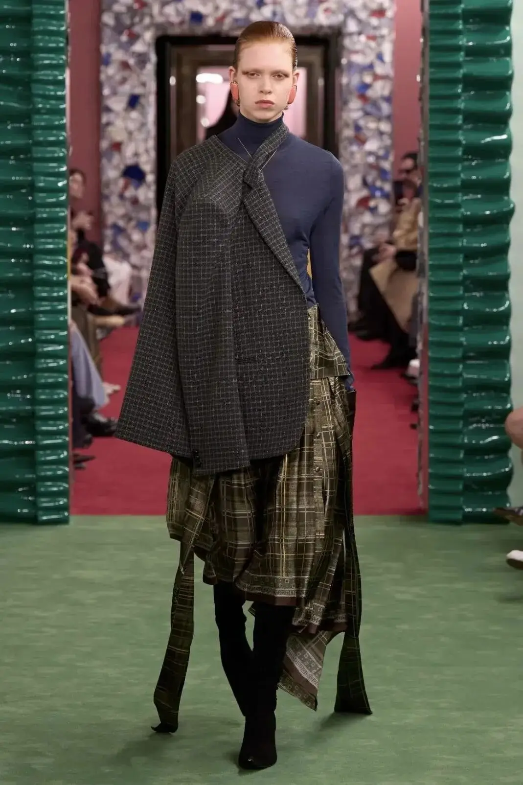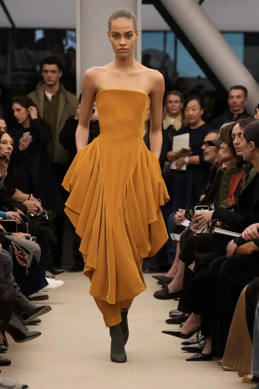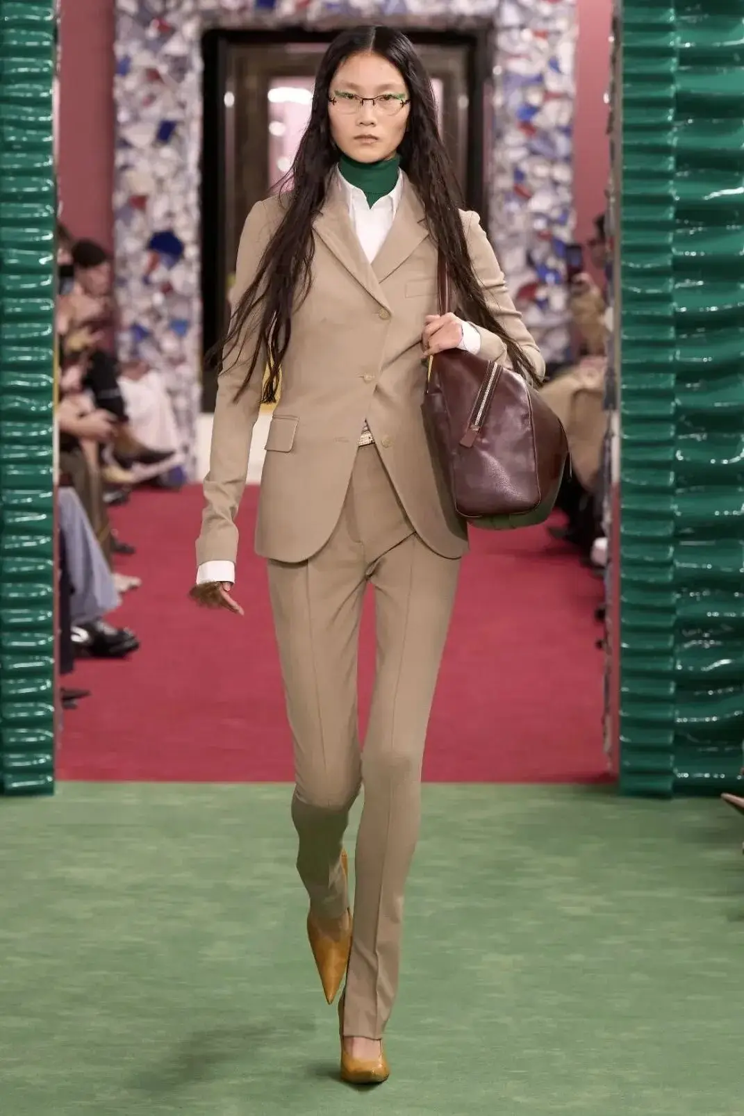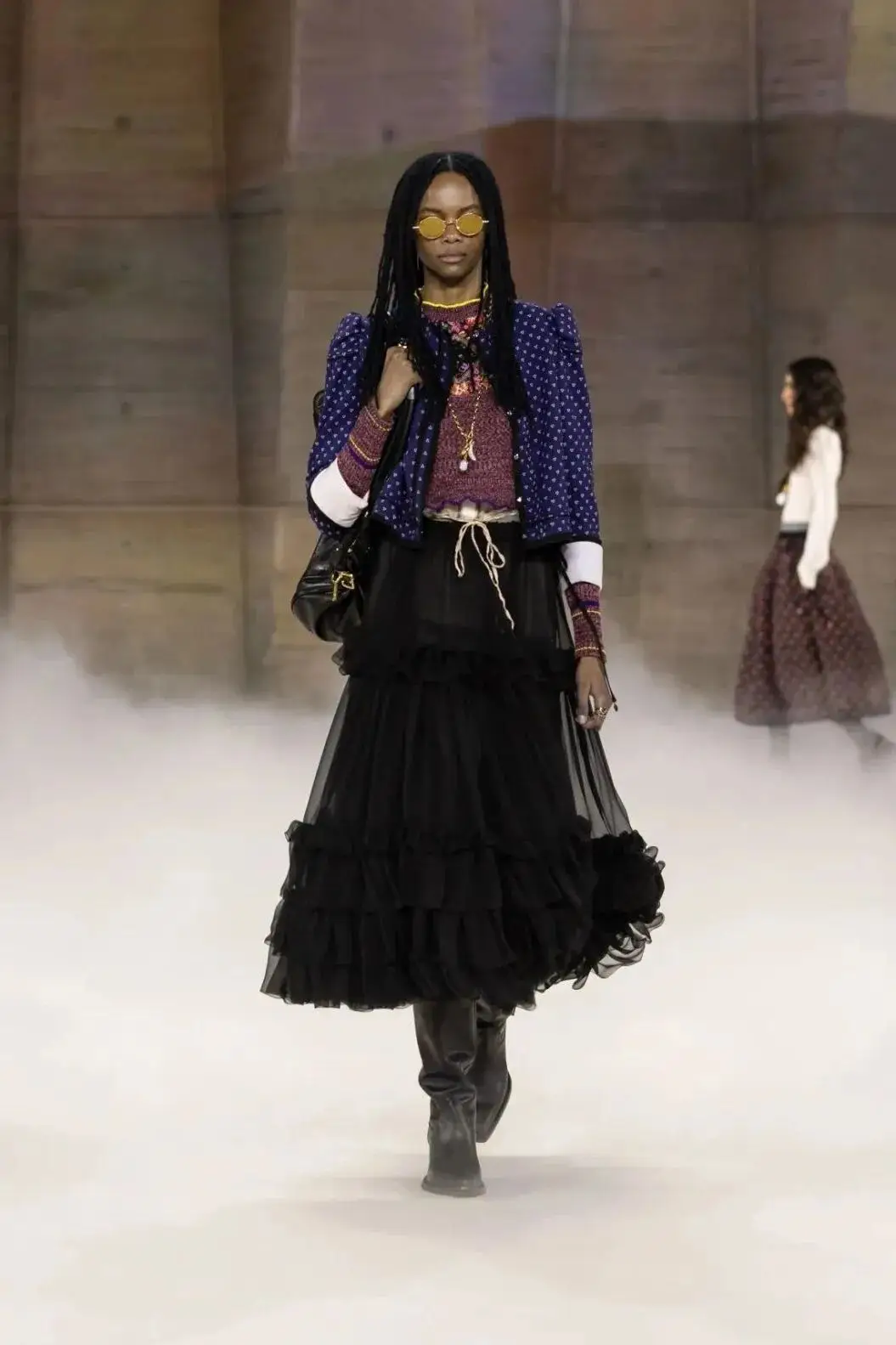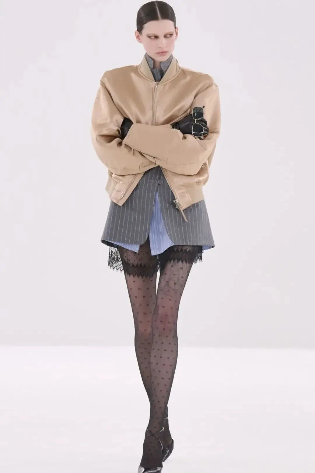 恰逢Lanvin男装诞生百年,Copping亦将男装结构引入女装语言。羊毛、法兰绒与麦尔登呢塑造出挺括的外套与西装轮廓,而衬衫与礼服则通过褶裥、省道与抽褶重新贴合身体曲线,在刚毅与柔美之间建立新的节奏。品牌经典的robe de style 廓形亦被重新唤醒——体量感裙摆在羊毛与真丝之间展开,随着步伐轻轻摆动,既保留历史比例,也显得更加轻松而现代。