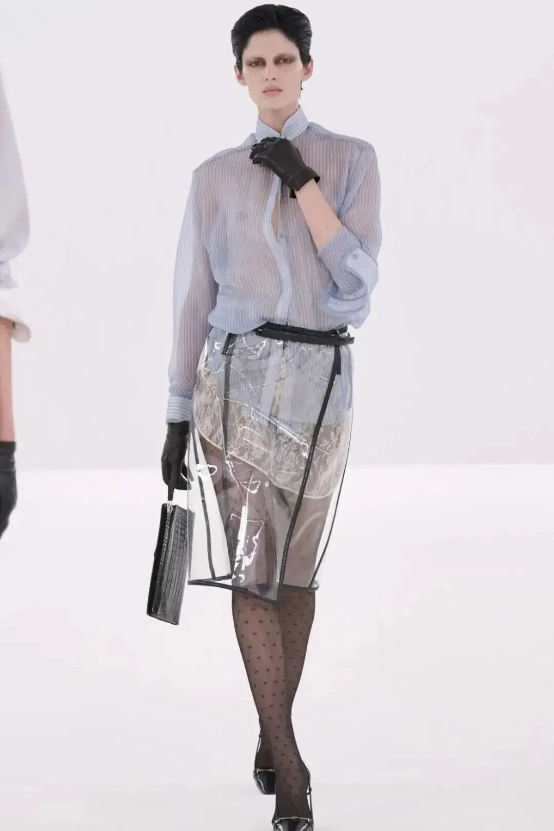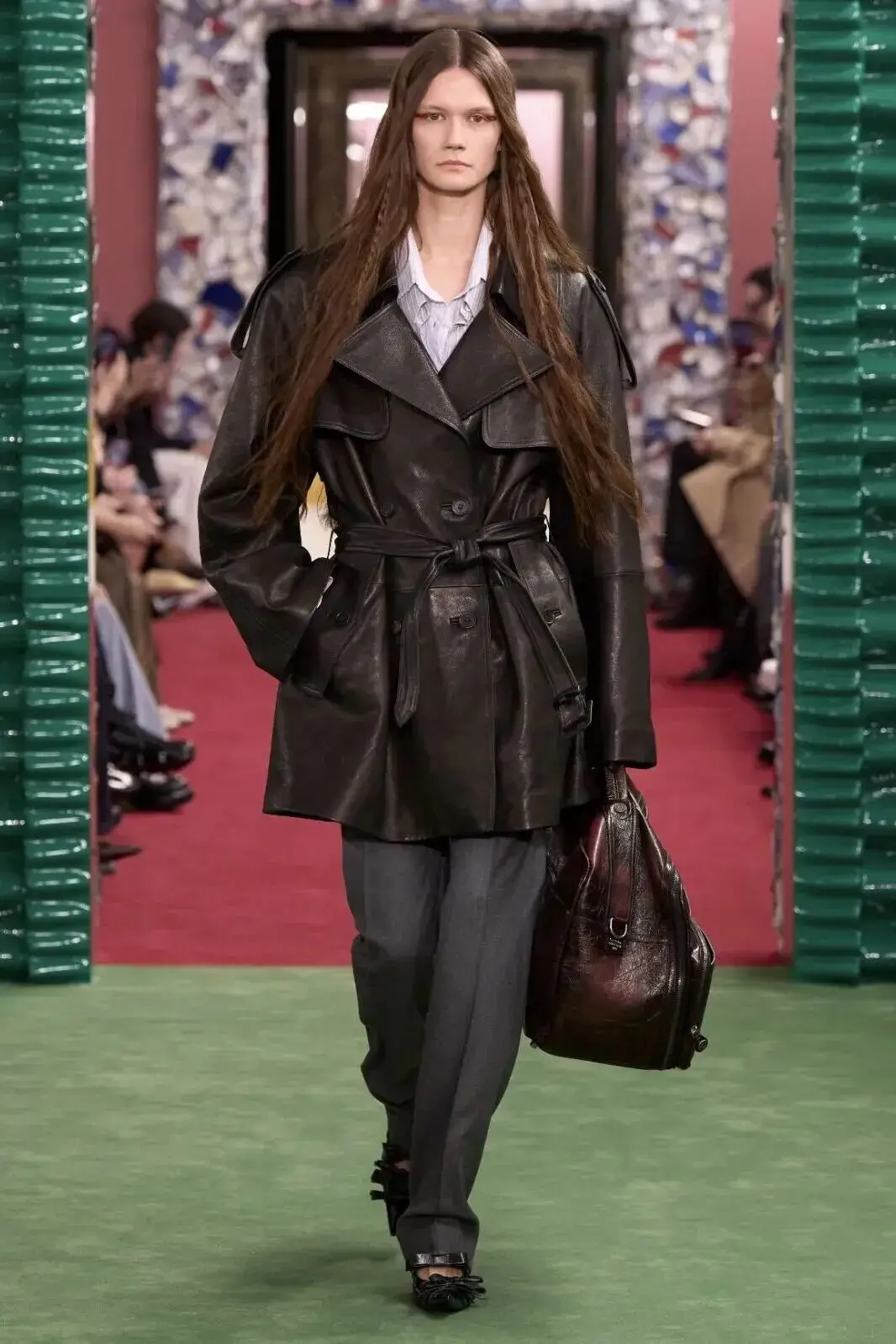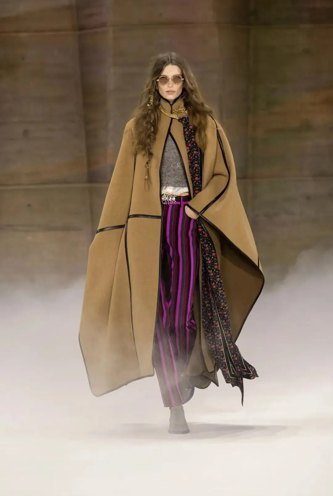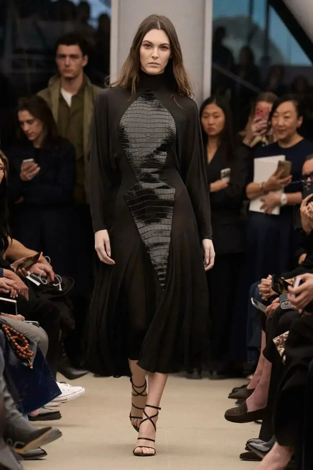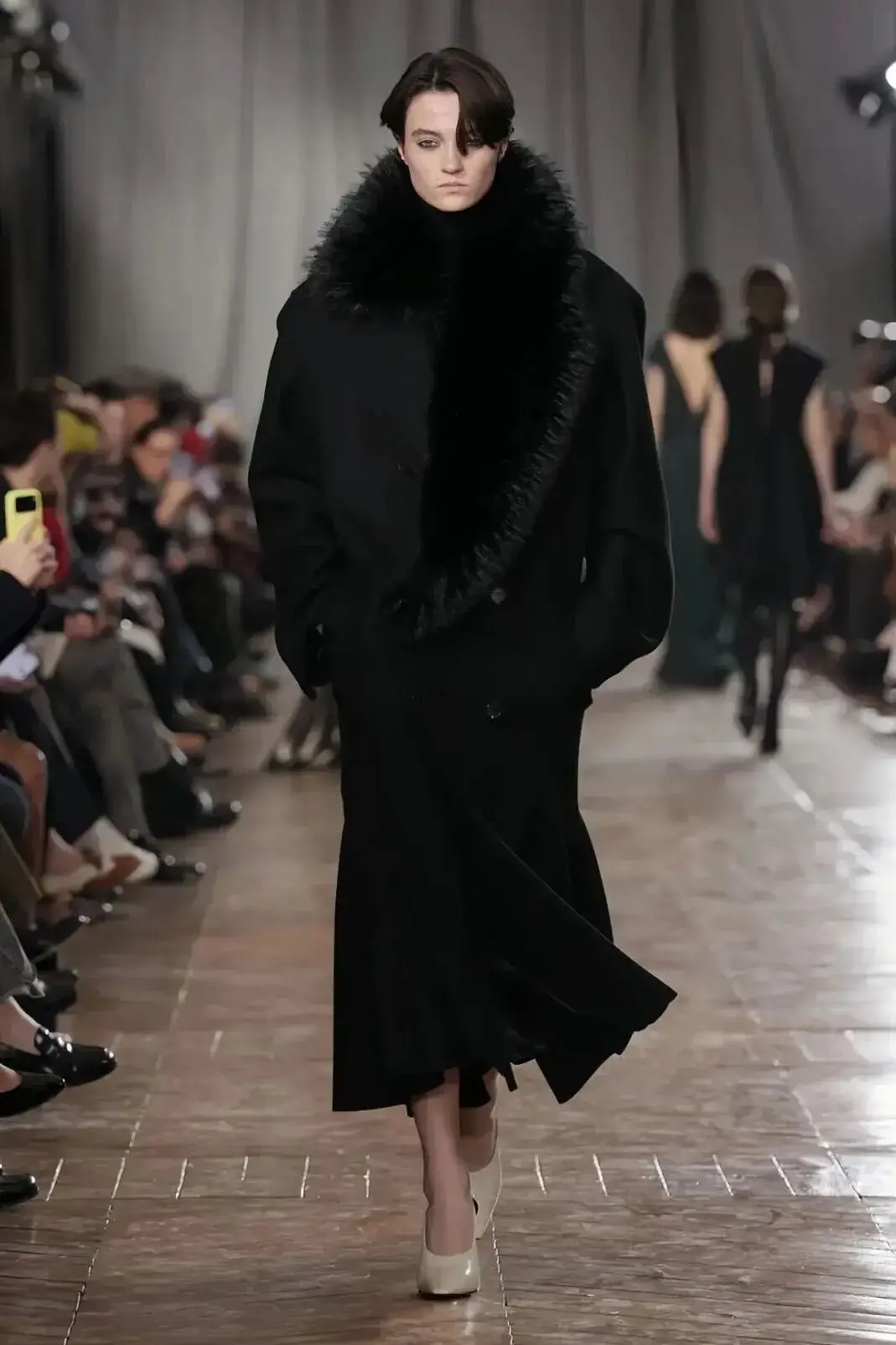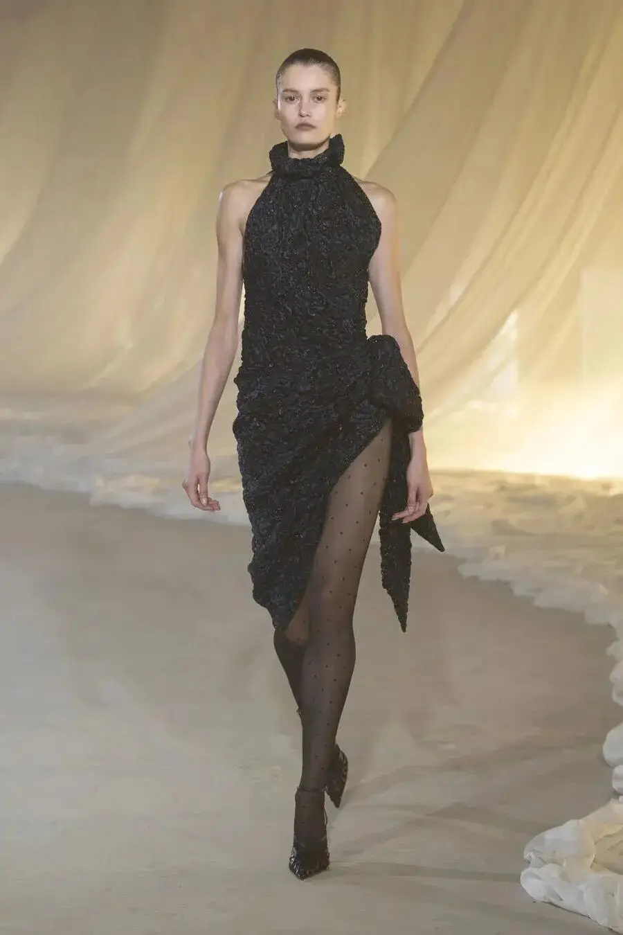 恰逢Lanvin男装诞生百年,Copping亦将男装结构引入女装语言。羊毛、法兰绒与麦尔登呢塑造出挺括的外套与西装轮廓,而衬衫与礼服则通过褶裥、省道与抽褶重新贴合身体曲线,在刚毅与柔美之间建立新的节奏。品牌经典的robe de style 廓形亦被重新唤醒——体量感裙摆在羊毛与真丝之间展开,随着步伐轻轻摆动,既保留历史比例,也显得更加轻松而现代。