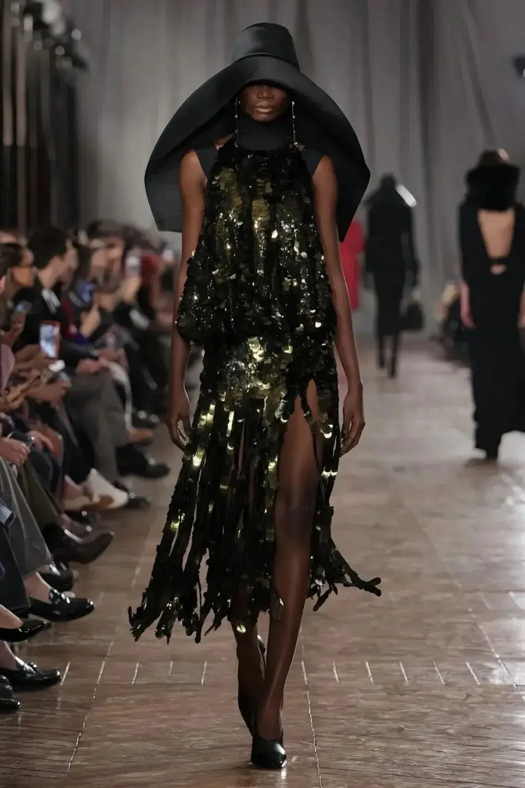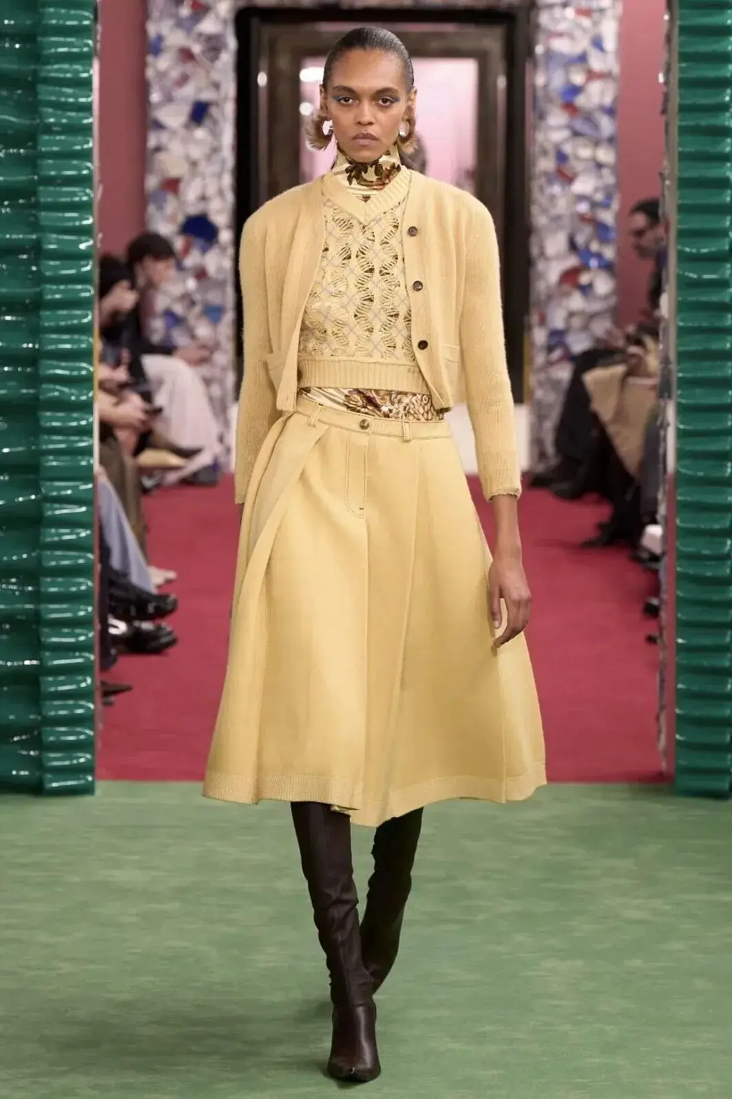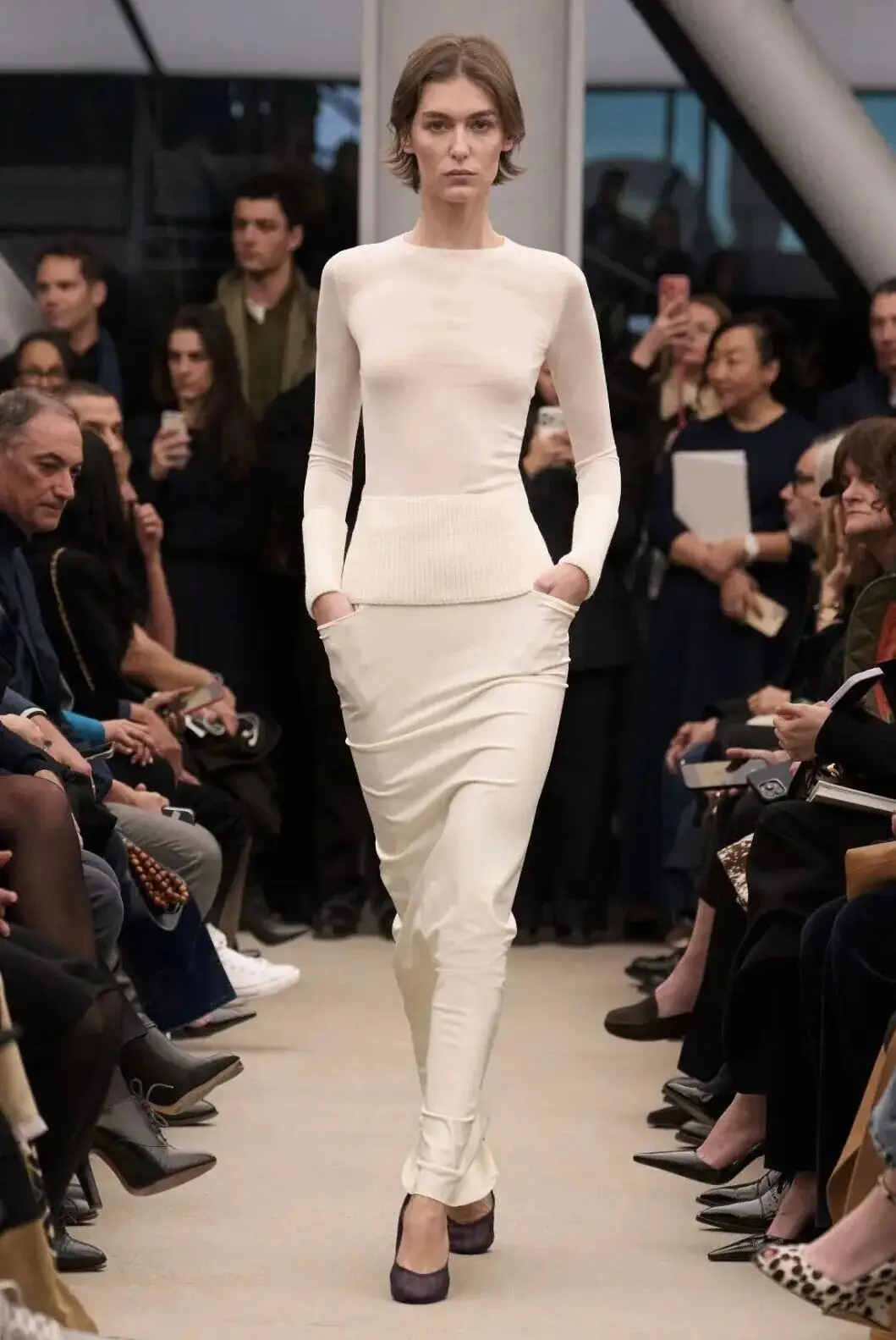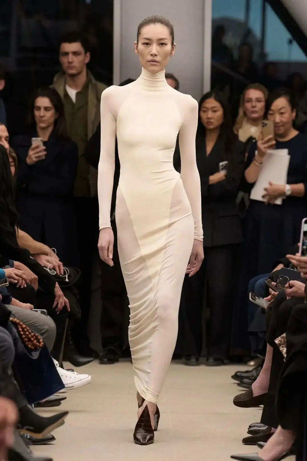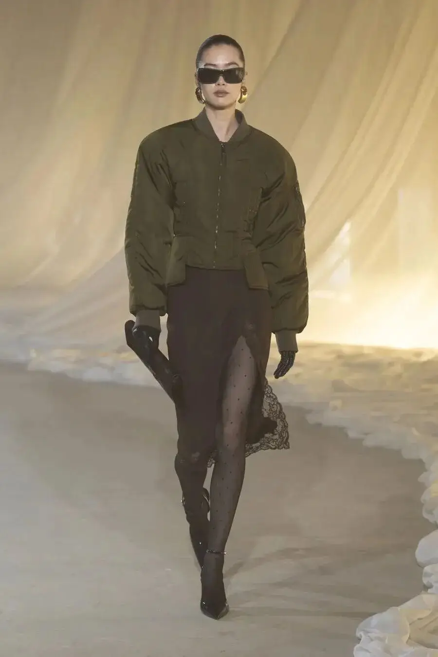 恰逢Lanvin男装诞生百年,Copping亦将男装结构引入女装语言。羊毛、法兰绒与麦尔登呢塑造出挺括的外套与西装轮廓,而衬衫与礼服则通过褶裥、省道与抽褶重新贴合身体曲线,在刚毅与柔美之间建立新的节奏。品牌经典的robe de style 廓形亦被重新唤醒——体量感裙摆在羊毛与真丝之间展开,随着步伐轻轻摆动,既保留历史比例,也显得更加轻松而现代。