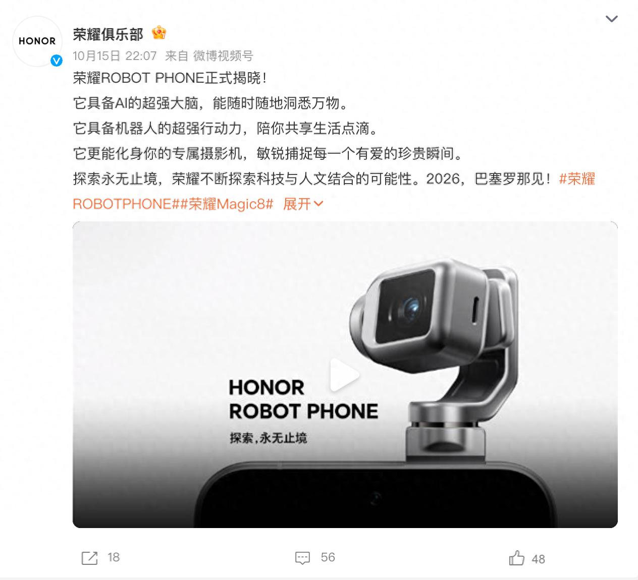 此次亮相的“Robot Phone”概念机,被视为未来版的 Magic8,也是荣耀 Magic8 AI 概念版。荣耀产品线总裁方飞表示,Robot Phone 是荣耀对 AI Phone 的一次探索和突破。Magic8 让荣耀有信心做出 Robot Phone 这样的未来 AI 终端形态产品,从而突破现在行业上手机的固有局限性,为 AI Phone 带来更多可能性。