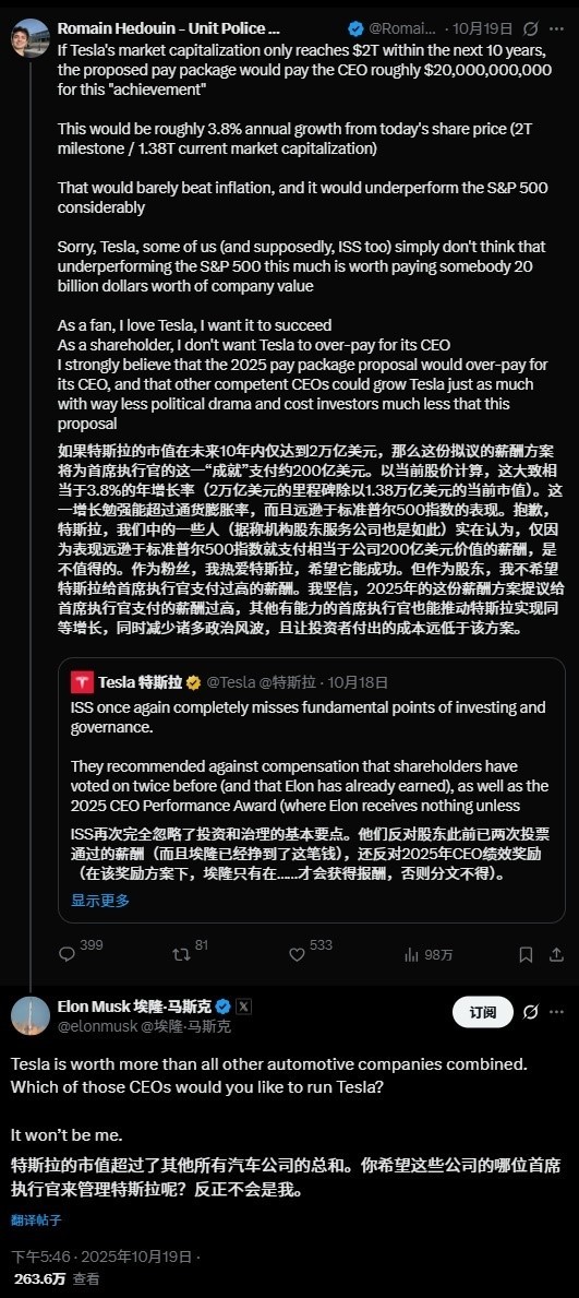 抱歉,特斯拉,我们中的一些人(显然也包括 ISS)认为,让公司价值缩水如此之多却仍支付给某人 200 亿美元的报酬,是不合理的。作为一名粉丝,我热爱特斯拉,我希望它成功;但作为一名股东,我不希望公司为其 CEO 支付过高的薪酬。我坚信 2025 年的薪酬提案存在严重高估,其他有能力的 CEO 完全可以在减少政治争议的同时,以更低的成本实现同等甚至更好的增长。