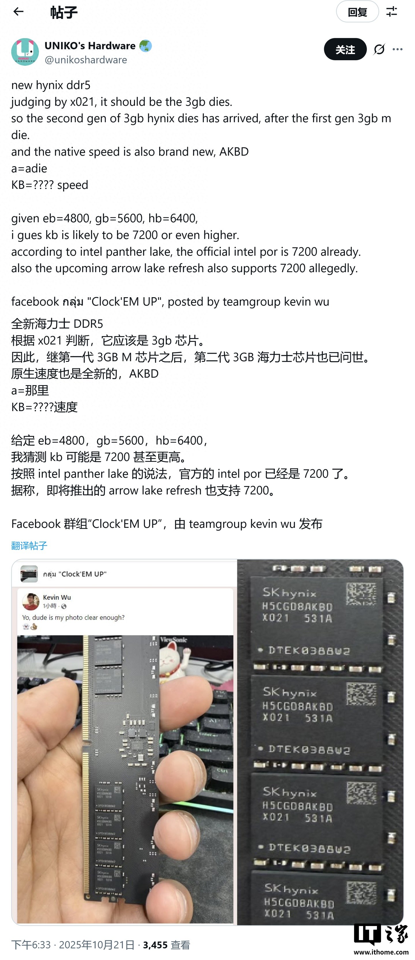 IT之家援引博文介绍,十铨(Team Group)的 Kevin Wu 在 Facebook 群组 Clock'EM UP 上发布了一款芯片,其颗粒上带有“X021”标记和“AKBD”部件代码。