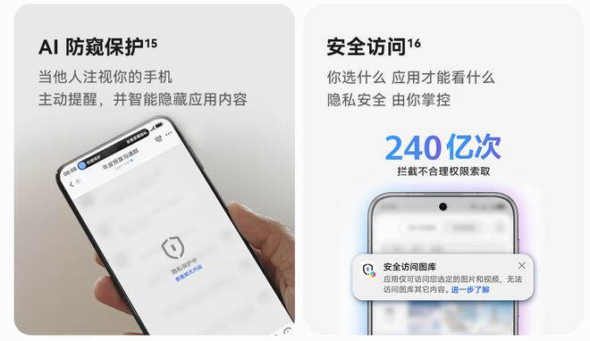 安全性进一步升级,星盾安全架构支持隐私风险实时预警;AI 防窥功能可识别他人注视,自动隐藏钉钉、银行等应用内容;同时,加密分享功能支持“仅可查看一次”。