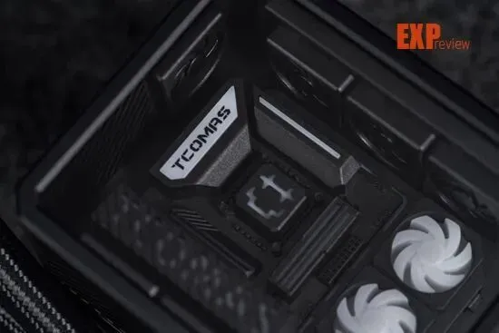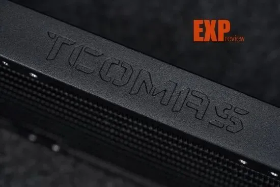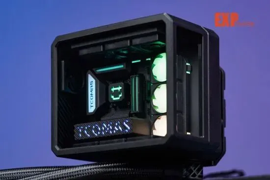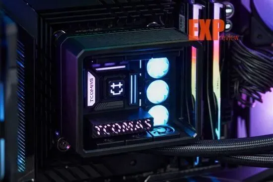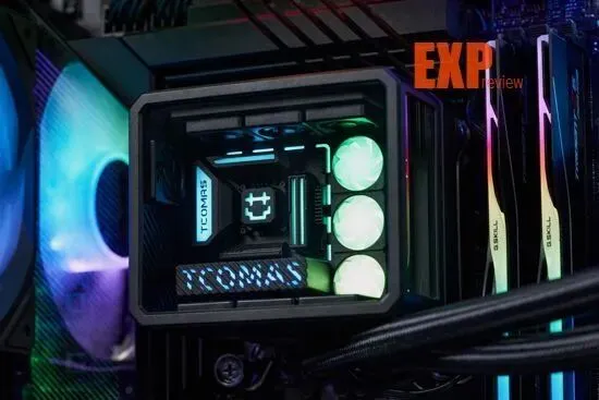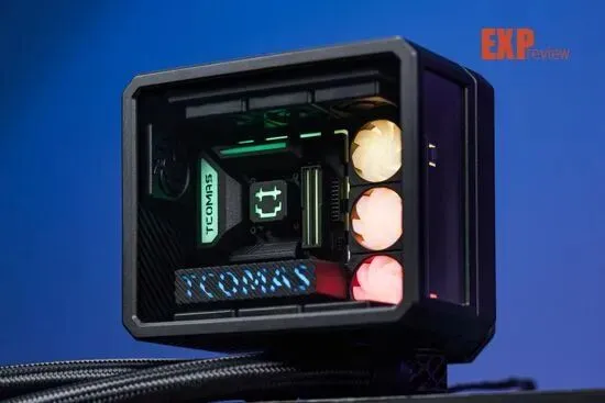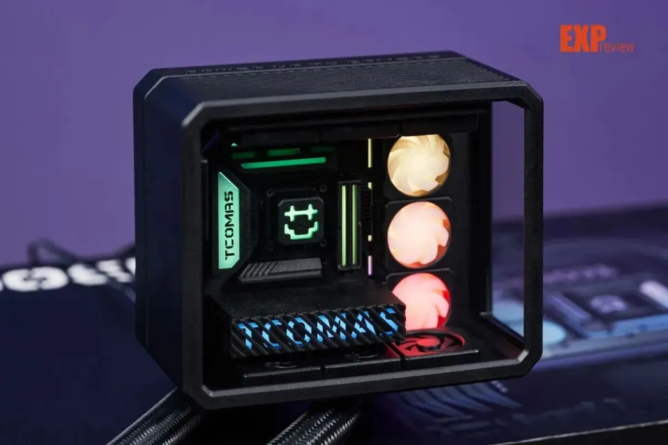 冷头上的“DIY组件”也相当有意思,主板、内存、显卡和水冷都是一应俱全的,看着相当精巧可爱。不过更有意思的是点亮冷头之后,这些“DIY组件”真的像海景房整机那样亮起灯来,让整台“主机”更加惟妙惟肖。钛钽在主板左侧散热马甲和显卡侧面都印上了品牌的英文名称“TCOMAS”,中央的冷头则是一个笑脸,右边的三把“ARGB风扇”大大提升了水冷冷头的灯光含量,看起来更符合海景房灯光拉满的“刻板印象”。