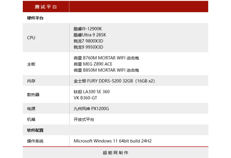 由于LA300 SE 360为无风扇版本,所以这次我们主要测试冷排本身的散热性能。至于对比的产品我们选择了目前比较热门的VK B360-GT,将后者的VK A12 ARGB风扇装到LA300 SE 360上来进行散热测试,看看同风扇下两者的散热性能区别有多少。测试平台除了我们常用的i9-12900K+B760M MORTAR WIFI以外,还加上了Ultra 9 285K+MEG Z890 ACE,以及Ryzen 7 9800X3D/Ryzen 9 9950X3D+B850M MORTAR WIFI,全面对比这两款产品的散热性能。