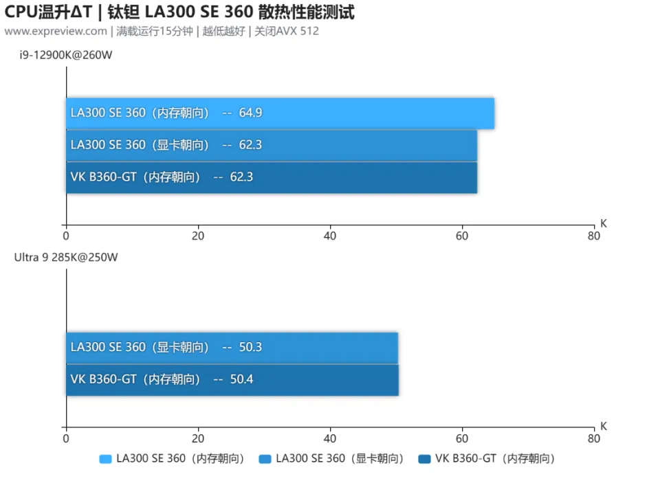 可以看到,LA300 SE 360在使用VK A12 ARGB风扇之后,其散热表现和VK B360-GT几乎一样,无论是12900K还是285K,两者的温升幅度都十分接近,同时水冷冷头的默认安装方向为冷管朝向显卡,因此LA300 SE 360朝向显卡的温升幅度是明显低于内存朝向的,用户安装时按照默认方向安装就好。