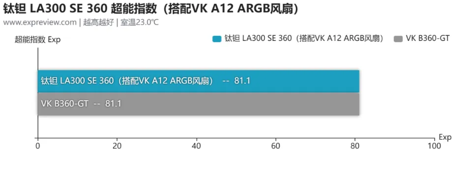 将上述基准平台的温升表现转换为超能指数后,LA300 SE 360的得分为81.1分,与VK B360-GT持平,其冷排性能是过关的。那么两者在AMD平台上是否能比较出区别呢?