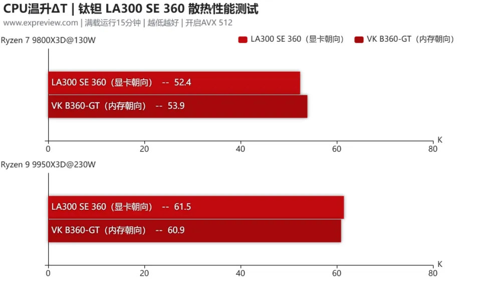 在AMD平台上,由于是扣具设计的原因,LA300 SE 360是固定冷管朝向显卡安装的。与Intel平台不同,LA300 SE 360在9800X3D上有比较明显的优势,温升幅度比VK B360-GT低了1.5℃,同时在更高功耗和发热面积更大的9950X3D上,LA300 SE 360也并未落后VK B360-GT太多,只相差了0.6℃。综合表现来看,LA300 SE 360在AMD平台上略微领先VK B360-GT,对专供游戏的Ryzen 7 9800X3D优化更好,更适合游戏党选购。
