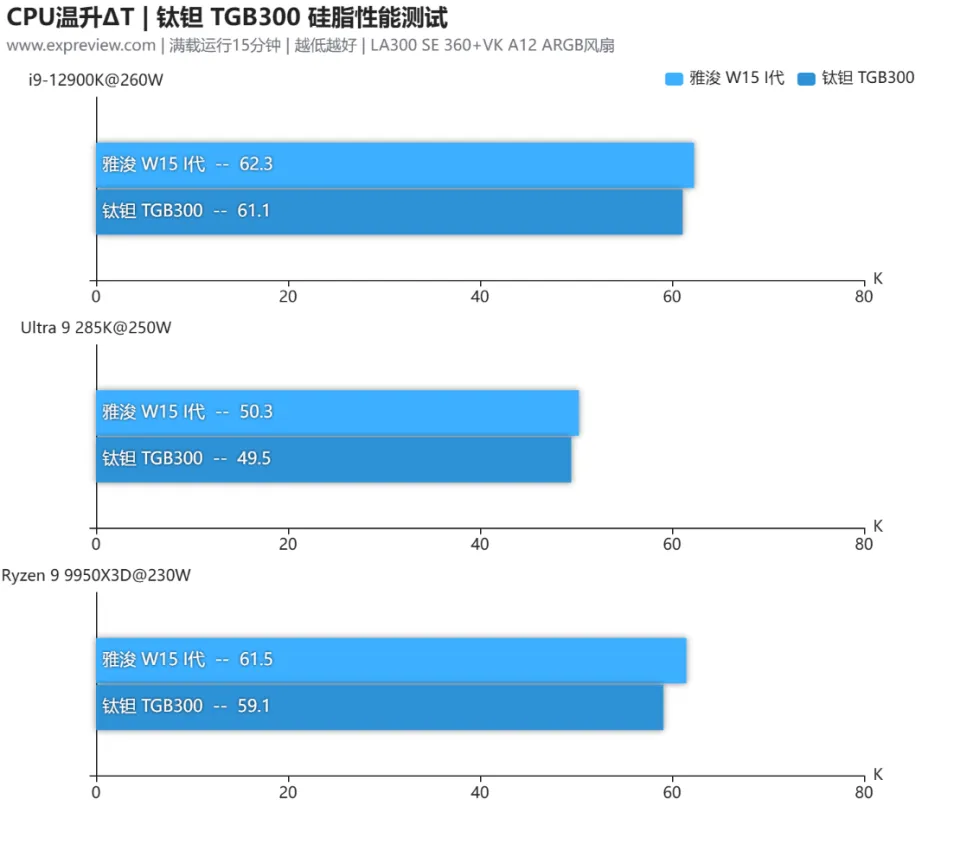 前面提到过,LA300 SE 360冷头上预涂了钛钽自家的TGB300高性能硅脂,我们也顺便测了一下这款硅脂的性能表现如何,对比的硅脂是我们测试散热器时一直使用的雅浚W15 I代,分别在i9-12900K/Ultra 9 285K/Ryzen 9 9950X3D上搭配LA300 SE 360来进行测试。测试平台设置和流程与散热测试一致,测试时室温在22.5~23℃之间。