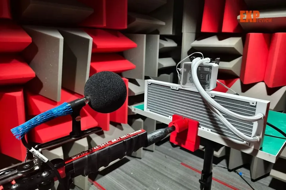 噪音测试场景为我们专门升级过后的消音实验室,室内面积是原来的两倍多,环境噪音可控制在更低的10分贝以下,便于声级计更明显地感知到风扇在低转速下的噪音表现。我们这次测试了一下LA300 SE 360的冷头噪音,测试距离依旧是30cm。