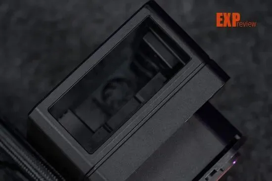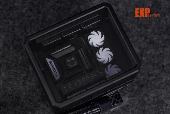 跟真正的海景房机箱一样,LA300的冷头可以从正面和侧面看到里面的“DIY组件”,两块透明面板相当通透,和平常的高透玻璃几乎没有区别。顶部和底部均有仿海景房MESH面板的斜纹装饰,同时整个冷头外壳做了哑光的磨砂处理,的确有几分喷漆面板的味道。外壳里面也有“机箱风扇”和“冷排”,标准的上冷排、下3风扇,后部1风扇的配置。如果想拆下外壳的话,可以在里面看到有四个卡扣,稍微用力摁下卡扣即可将外壳拆下,露出里面的“DIY组件”。