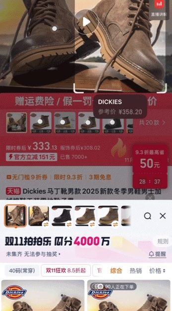 比如上面搜出来 358 元的工装靴,找低价表示,其实平台上卖得最贵的是 395,渠道款 333 才是最低价。