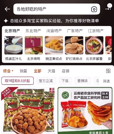 比如搜索 “ 各地好吃的特产 ”,搜索框下会弹出一个搜索清单卡。这就是算法总结了全网淘宝买家秀和购物经验,提炼出来的各地不踩雷特产。
