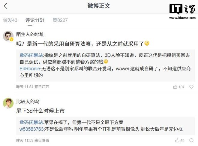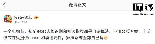 博主还在评论区回复了部分网友的问题:针对新一代采用自研算法还是从前就采用了?博主回复“指纹是之前就用的自研算法,3D 人脸不知道,反正这代是把模组买回去自己调试,供应商都赚不到整套方案的钱。”针对屏下 3D 人脸何时上市?博主表示“苹果在搞了,但第一代不是全屏下方案。”