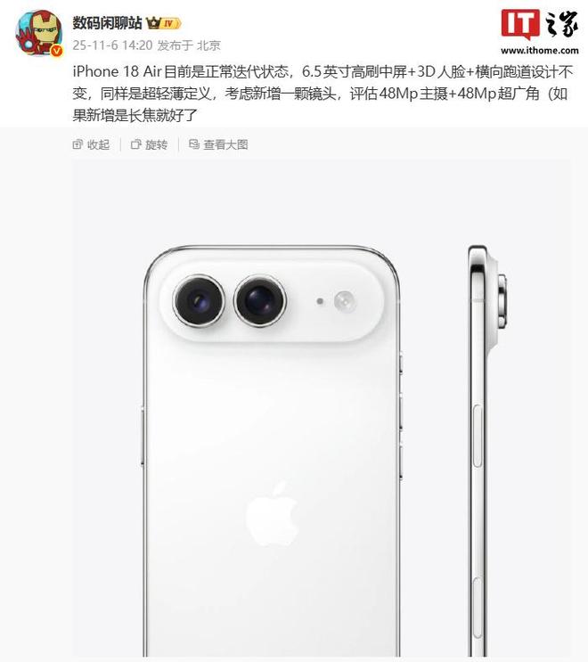 IT之家 11 月 6 日消息,博主 @数码闲聊站 今日发文透露,iPhone 18 Air(此处预计指第二代 iPhone Air)目前是正常迭代状态,6.5 英寸高刷中屏 + 3D 人脸 + 横向跑道设计不变,同样是超轻薄定义,考虑新增一颗镜头,评估 48Mp 主摄 + 48Mp 超广角。