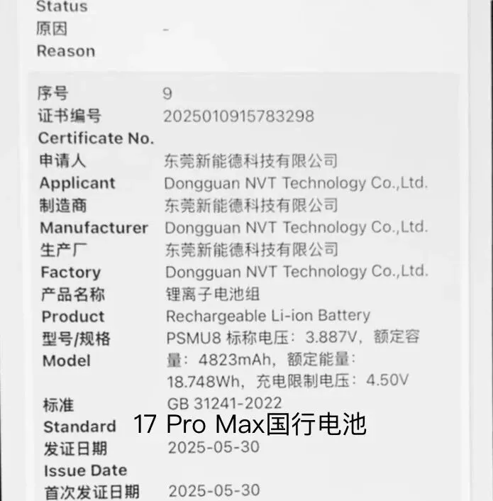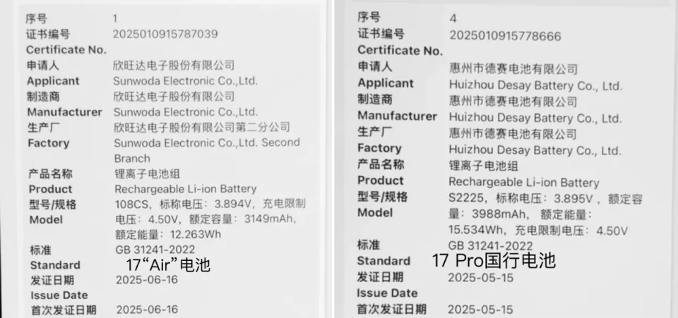 而日前,一份质量认证中心的资料被曝光,里面详细的写了关于国行 iPhone 17 三款机型的电池情况。