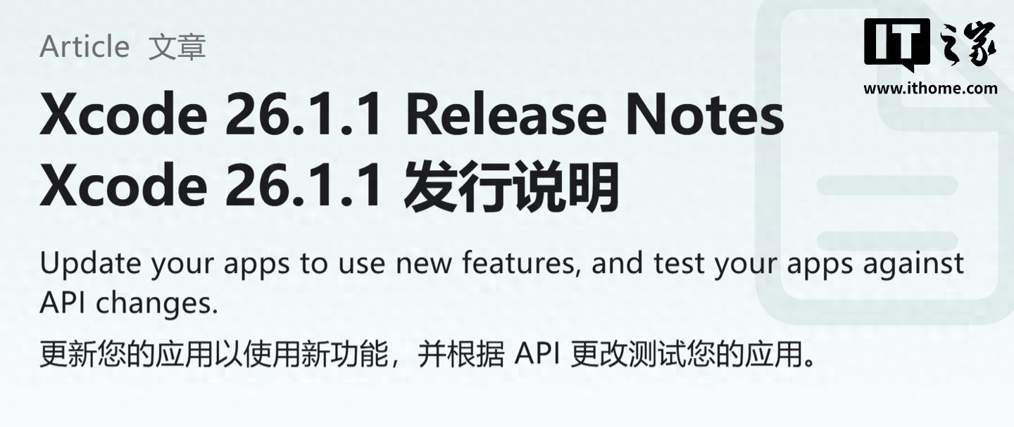 IT之家 11 月 12 日消息,科技媒体 9to5Mac 昨日(11 月 11 日)发布博文,报道称苹果发布 Xcode 26.1.1 版本更新,主要聚焦于修复一系列漏洞,并显著优化了其全“编码智能”(Coding Intelligence)AI 编码辅助功能的性能。