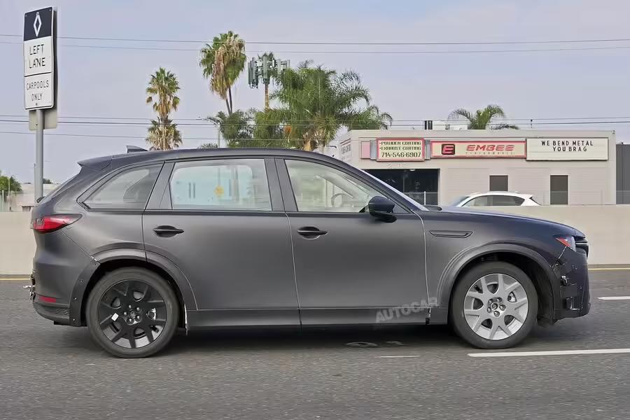 这些原型车外观酷似 CX-90,但车身尺寸明显缩短,从前门与前轮拱之间的距离可以看出,相比前者,新车结构发生了变化。这款车比 CX-90 更加紧凑,轮子完全被轮拱包围,显示出其紧凑的设计。