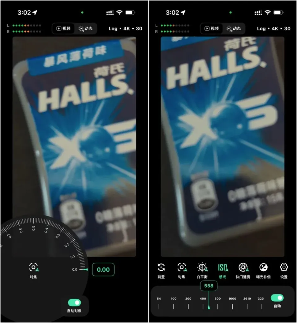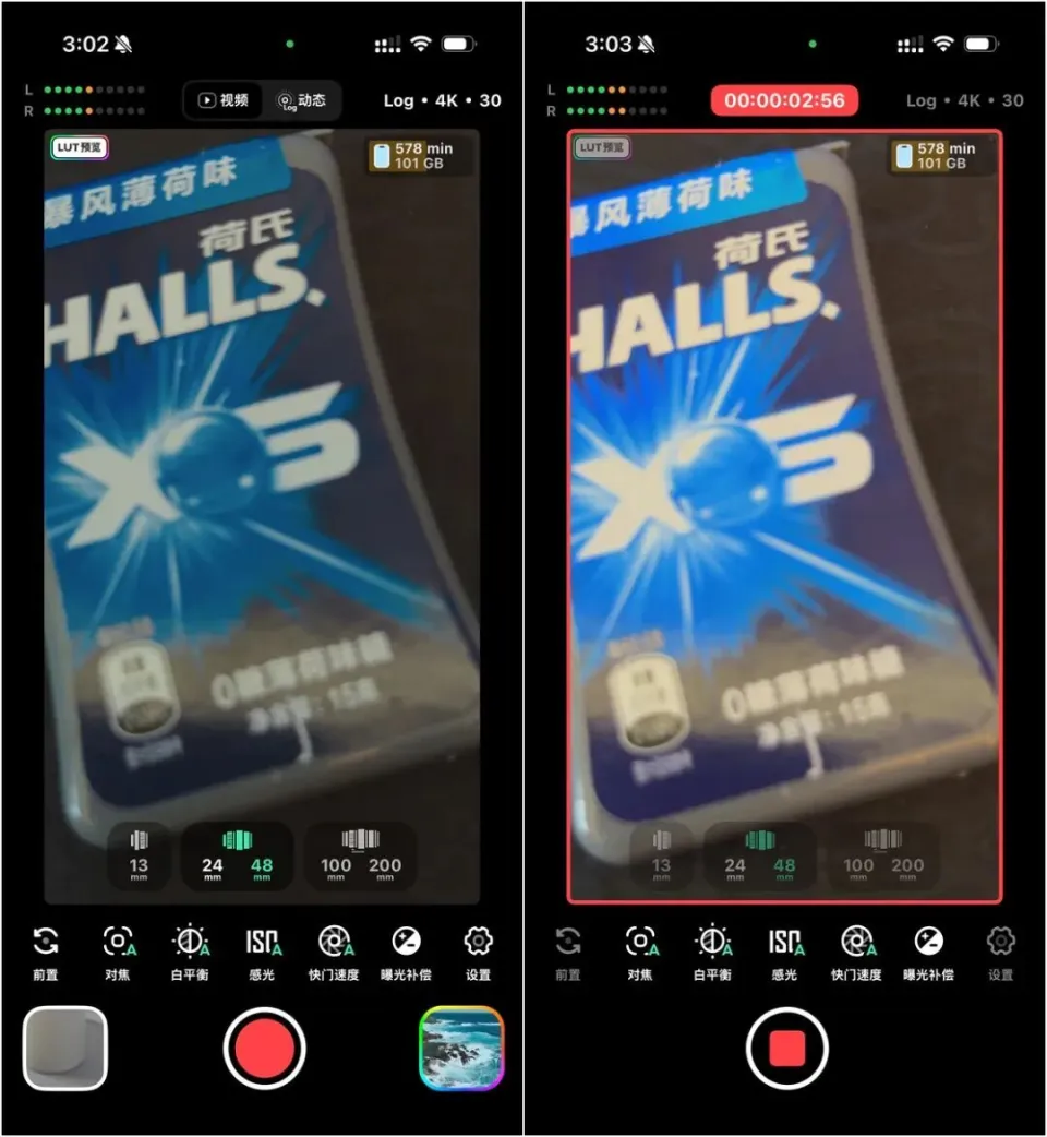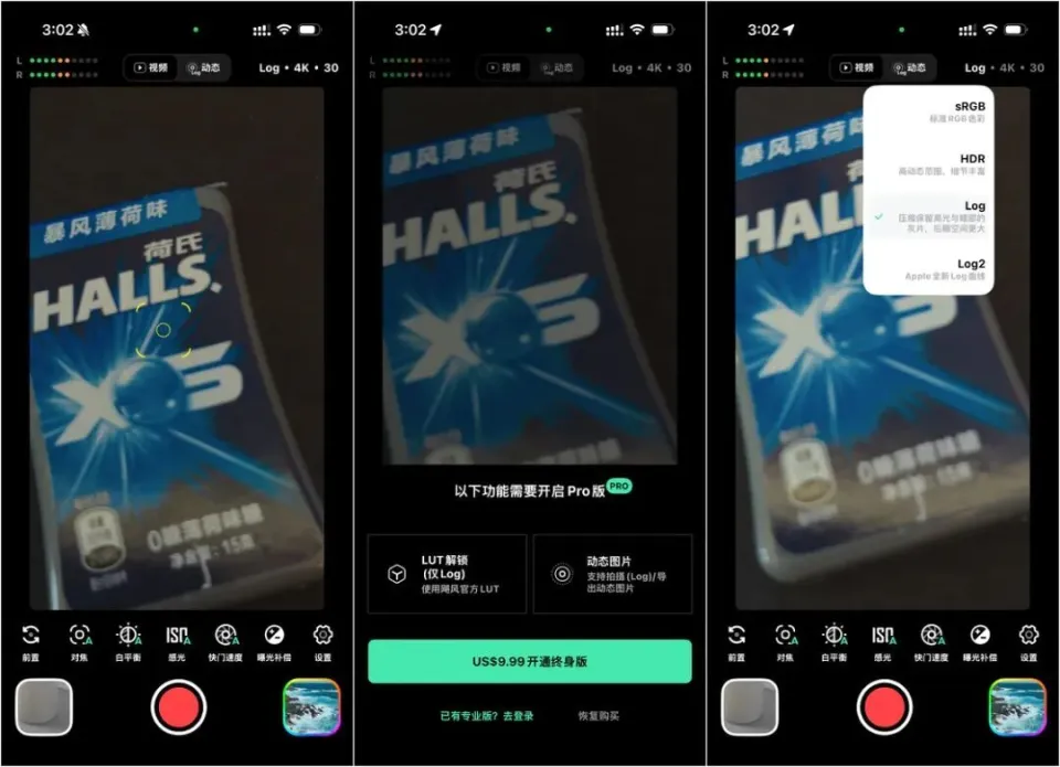 打开飓风相机后,默认处于视频拍摄模式,你也可以在顶部标签页切换为动态图片(Log)拍摄模式,不过这个是付费功能。在视频拍摄模式下,取景窗口的左上角是左右两个麦克风的收声情况,右上角是视频格式选择器,点击即可选择格式、分辨率和帧率。在格式选择菜单,飓风相机为 sRGB、HDR、Log 和 Log2 格式分别标注了相应的介绍,这对非摄影专业人士来说非常友好。