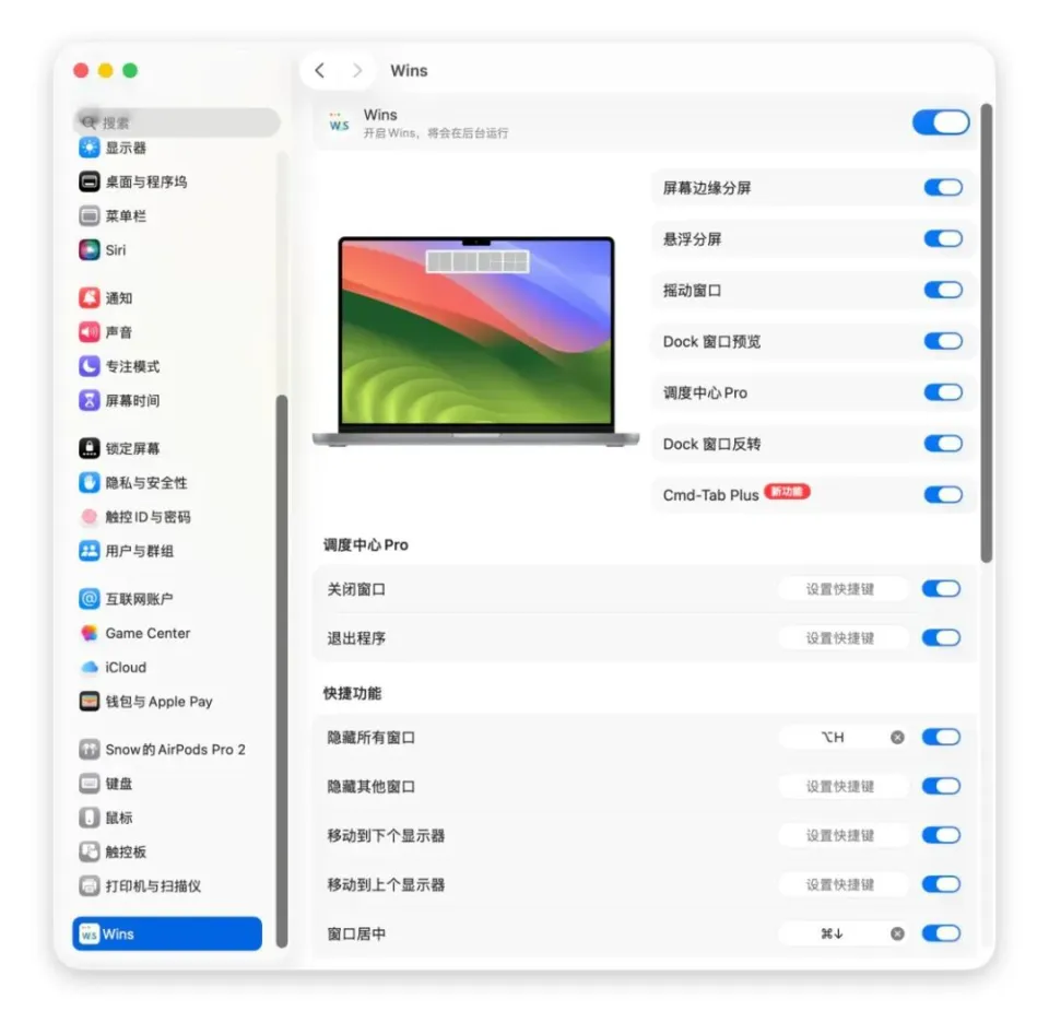 Wins 还为用户提供了一套堪比 Magnet 的多窗口分屏方案,除了拖动窗口到屏幕边缘实现左右分屏及全屏操作外,Wins 还会在窗口移至顶部时,以悬浮窗的形式提供 4 种分屏预设,你只需将窗口拖动到悬浮分屏上即可实现快速拆分。应用还提供了隐藏所有窗口、隐藏其他窗口、窗口居中等快捷功能,你都可以在「系统设置」>「Wins」中自定义独立的组合快捷键。