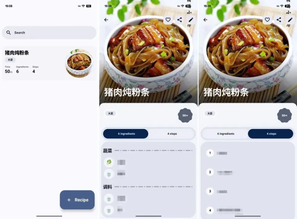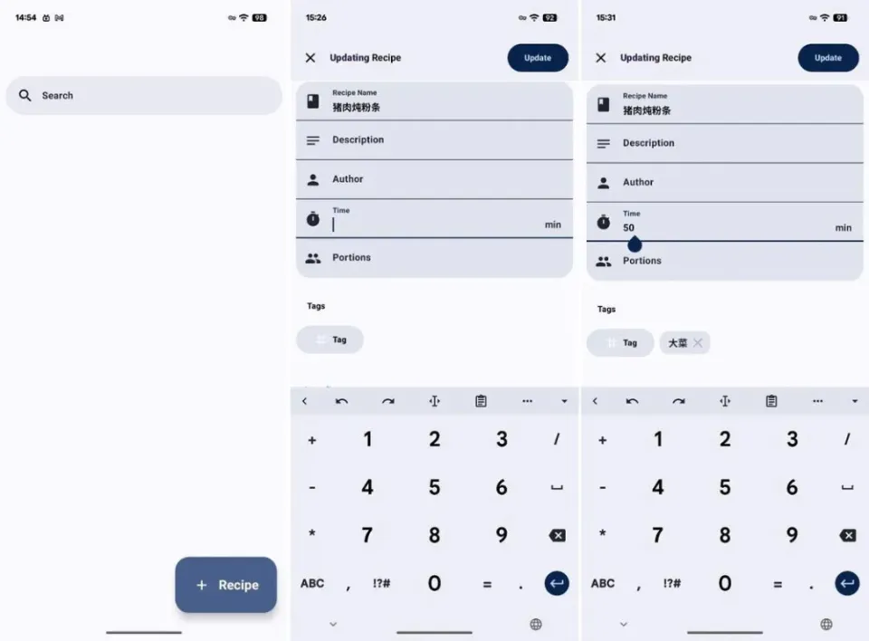 点击应用右下角添加,将成品或是预先准备的食材拍照,增加菜谱的美观度,然后输入菜谱的名字,在描述一栏可以增加对这道菜的评论或喜爱程度等。如果菜谱来自你喜欢的 up 主,也可以备注上作者姓名,当然自创菜谱也会让你有不小的成就感。增加预估的时间来合理评估做菜时长,应用默认给出的计时单位是分钟,或许对于一些蒸煮类的中餐来说稍显不足。完成这些前期工作后,你还可以给你的菜打上标签,例如「健康餐」「素菜」等等。