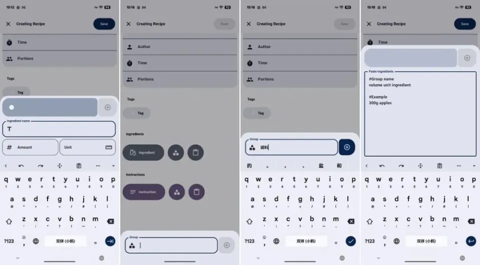 来到正式环节,我们需要把要用到的原材料逐一添加进来,包括原料的名称、重量等信息,为了避免大量食材混杂在一起导致备菜困难,我们还可以善用 Hungry 的分组功能,为不同种类的食材添加分割线,或是给食材添加上 emoji,增强食材的辨识度和菜谱编辑的趣味性。应用原本是好意,增加了输入食材自动联想 emoji 的功能,不过在中文语境下应用的联想只能说风马牛不相及,譬如将「羊肉」识别为「绿茶」还得靠我们后期手动输入。如果你是找的别人现成的菜谱,也可以直接使用应用的粘贴按钮,将所需食材名称全部粘贴上去。
