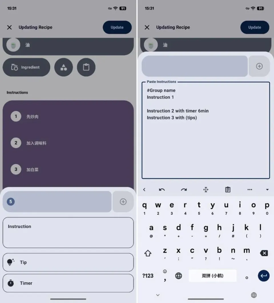 之后我们便可以开始添加烹饪步骤,Hungry 允许我们将做菜步骤逐一进行添加并备注时长和相应的介绍、小技巧等,同样的,这里也支持直接大量粘贴,只要我们的内容符合应用给出的内容结构即可。总的来说,Hungry 在能够节省编辑成本的地方都给出了一定的解决方案,毕竟如果创建菜谱比做菜还麻烦,谁还愿意手动维护菜谱。
