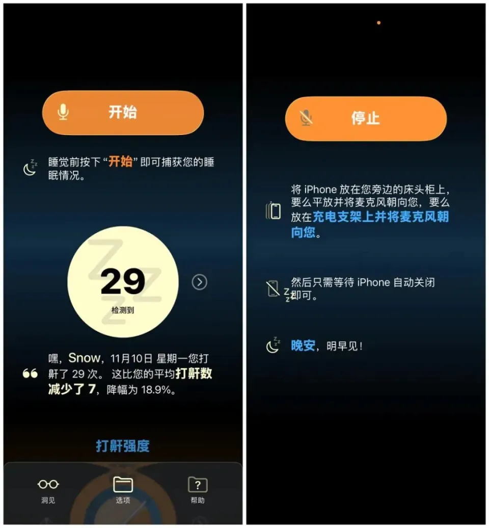AutoSnore 使用方法非常简单,首次启动输入你的昵称后,只需在睡觉前将 iPhone 麦克风朝向自己,点击应用主屏的「开始」按钮,一觉醒来后点击「停止」按钮,应用就会自动记录并分析,从打鼾次数和强度两个维度,以「打鼾云」中白色圆点的云状分布,直观地呈现你睡觉时的打鼾情况。除了针对当前睡眠周期的解析外,AutoSnore 还会自动对比过往数据,帮你横向评估睡眠质量。