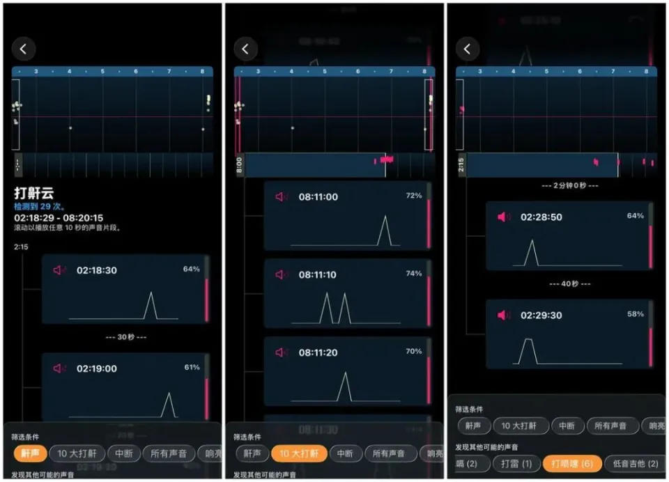 进入打鼾云,你还可以回放睡眠期间记录的声音片段。借助内置算法,AutoSnore 可以将鼾声片段拆解出来,并分析出「十大鼾声」,方便你快速定位呼吸异常最严重的时间段,进而采取应对措施。此外,应用还会为其它声音自动打上人声、乐器、外界噪音、自然声效等标签,你可以根据标签按需回溯,看看昨晚在梦里和什么人打了招呼。