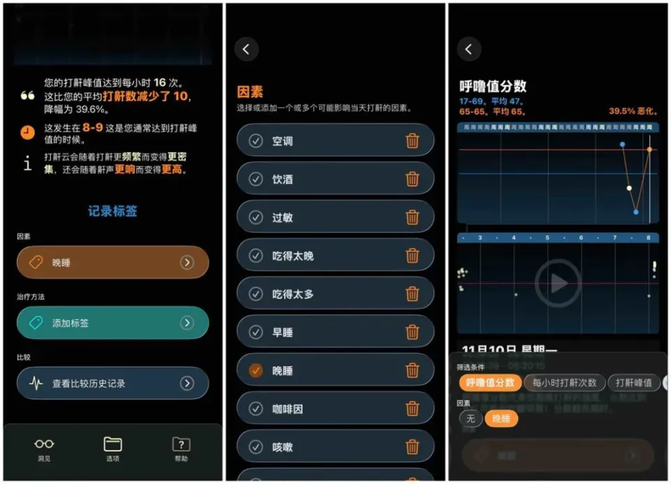 下滑至主屏底部,AutoSnore 还提供了一套手动标签工具,可手动添加任何影响睡眠和打鼾的因素,比如是不是感冒或太过疲劳,又或是换了枕头用了药,便于你更好地梳理适用于自身的优化睡眠的措施。