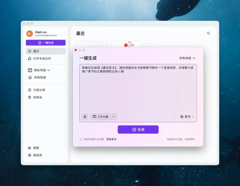 在新版 XMind 的侧边栏,出现一枚「一件生成」按钮,这里就是 AI 创作功能的入口。在弹出的「一键生成」窗口中,我们可以将任何内容包括短文、文档、网站或网页视频改写为结构化的思维导图,这令创作思维导图这件事变得非常简单。