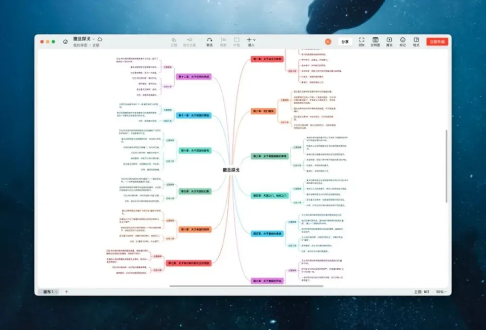经过我的简单测试,使用 XMind AI 辅助创作思维导图,可以减轻大量的结构调整和格式排版工作量。我最近在阅读《撒旦探戈》,要求 XMind 按照章节制作一个思维导图介绍每个章节的剧情和出场人物。下图是 XMind 做出来的思维导图,确实像那么回事,章节名称、主要剧情、出场人物的结构完全符合要求,色彩的搭配和文字长度控制得也很和谐。只不过,思维导图中的内容和这本书的章节和人物完全不对,剧情也大相径庭,XMind 的 AI 陷入了幻觉之中。