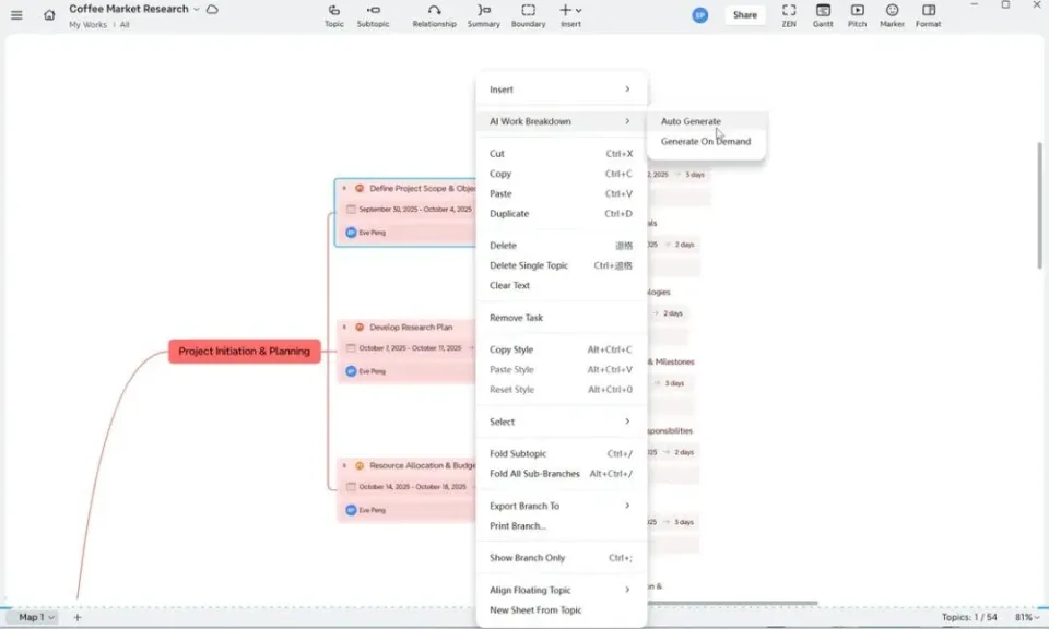 AI 工作分解功能可以将项目分解为可执行的任务,自动设置时间线和优先级等。我们可以在一开始生成思维导图时,就使用工作分解功能;也可以在思维导图中,点击任意一个节点,右键使用 AI 工作分解。这项功能可以把思维导图直接转化为任务计划来执行,非常方便。