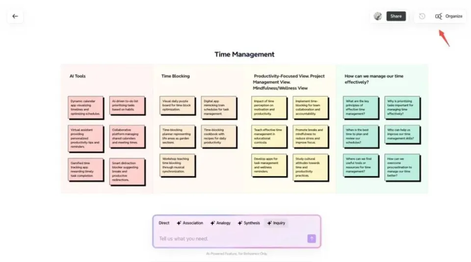 在网页端,XMind 还有更多的 AI 辅助功能,这些功能会在未来陆续加入到桌面端和移动端中。首先是头脑风暴,Brainstorming 可以通过 5 种 AI 辅助的头脑风暴模式探索创意。本质上这项功能是对话体 AI,在输入框中描述我们的需求,选择「直接、联想、类比、综合、探索」五种头脑风暴的场景风格,AI 经过分析就能生成灵感卡片,并将其生成一个精美的思维导图。