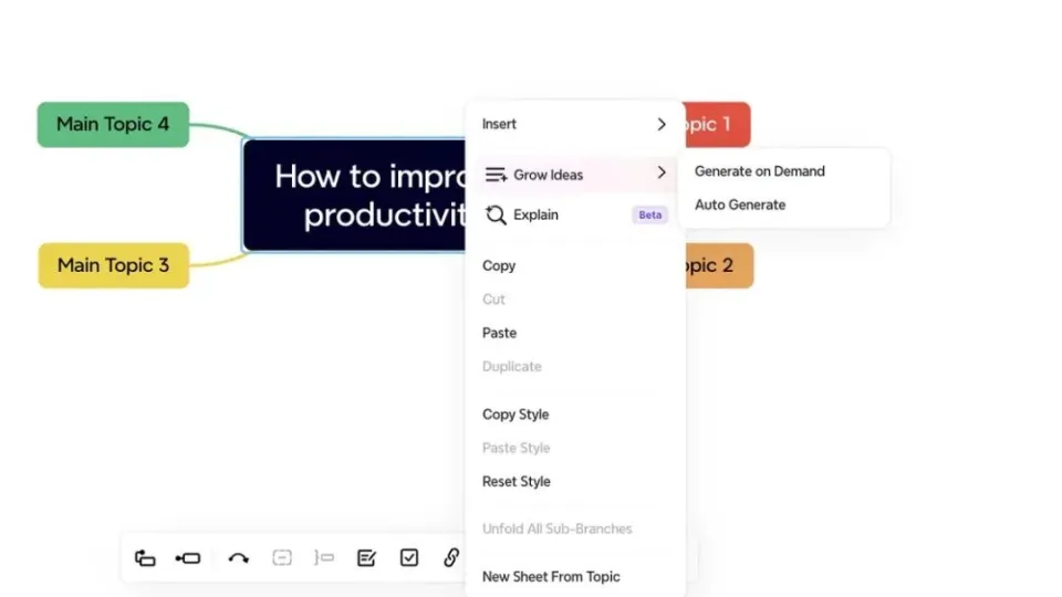 Grow Ideas 可以通过 AI 辅助功能扩展思维导图中的任何主题或子主题。选择任意一个节点上,在工具栏上的最右侧就是 Grow Ideas 功能图标。在这里我们可以选择按需生成或自动生成,让 AI 分析思维导图之后生成一个全新的创意,并自动添加一个节点。