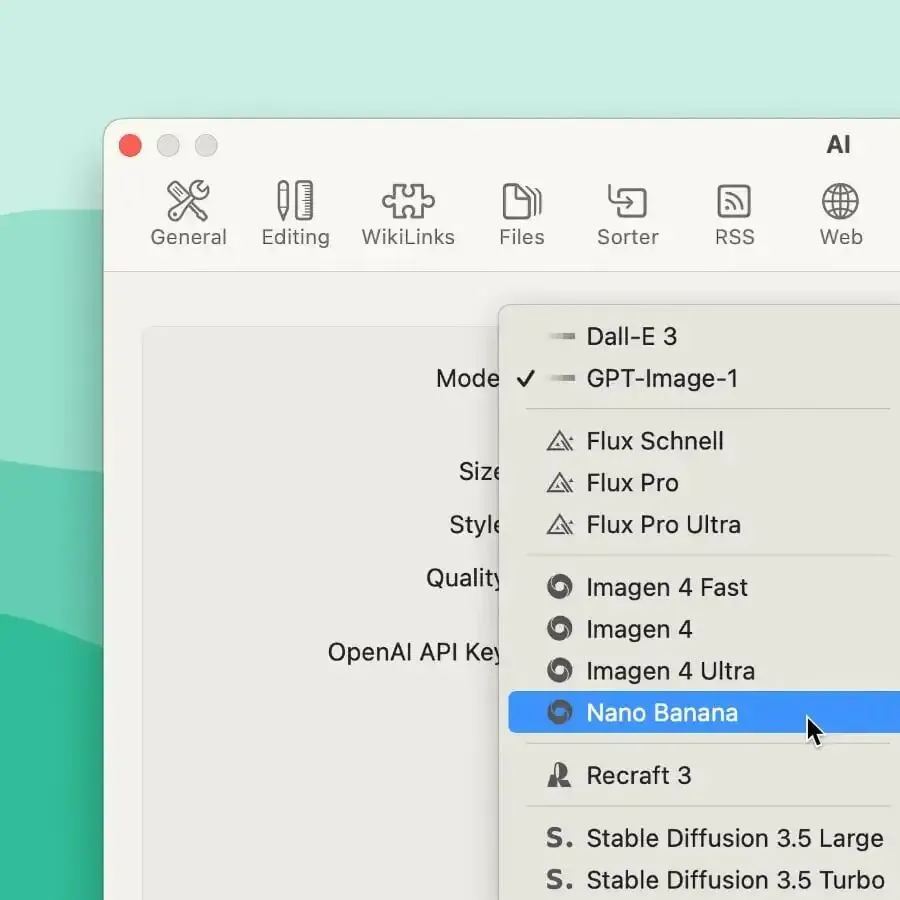 相比于 v4.0 中正式引入了 AI 功能,v4.1 最终重要的变化即进一步的开放 AI 功能,相比于此前局限使用某些特定的 AI 模型提供商所提供的服务,现在你可以通过 OpenRouter 或者 OpenAI(Compatibile)来接入你习惯使用的 AI 模型,例如xAI、百度、阿里千问模型等等;原生模型方面则增加了对 Claude 4.1 Opus、Claude 4.5 Sonnet、Gemini 2.5 Flash Lite、OpenAI GPT-5、Google Imagen 4 、Mistral、Google Nano Banana 以及 Ollama Cloud 的支持;另外,所有 Perplexity Sonar 模型都包含视觉功能,你可以在调用视觉模型时选择。