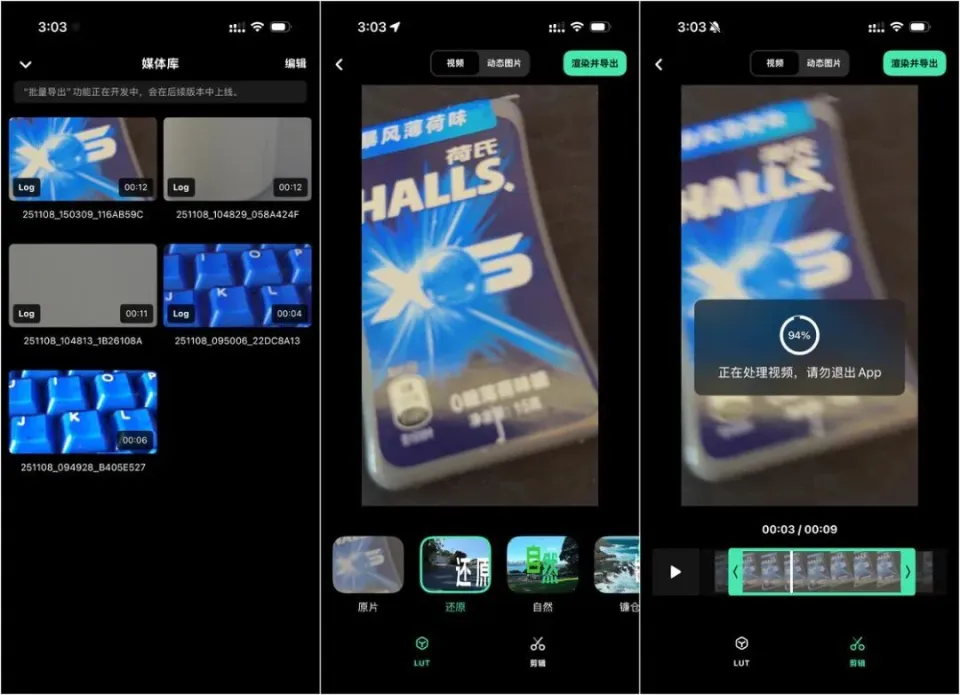在摄制按钮的左侧是媒体库,可以在媒体库中对影片进行编辑,包括应用 LUT 以及简单的剪辑,完成后可以进行渲染并导出。当然,你也可以将视频导出为动态图片,不过这需要购买 Pro 会员。
