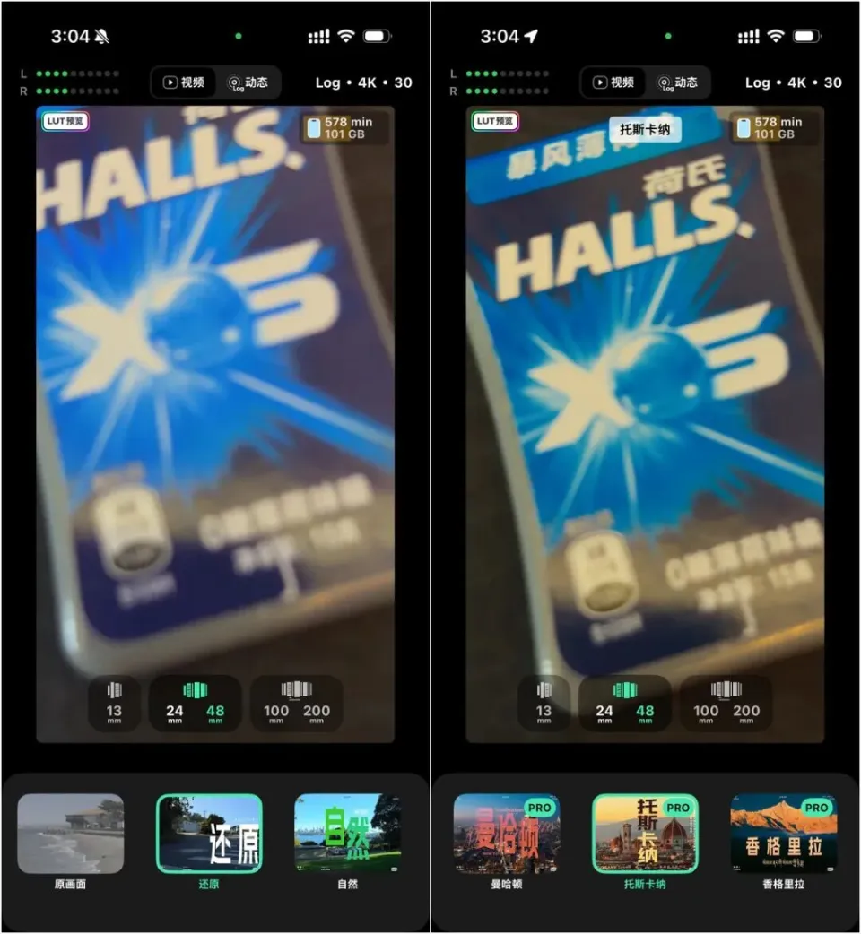 在摄制按钮的右侧是 LUT,飓风相机提供了多款内置的 LUT 供我们直接使用,点击即可在取景窗口进行即时预览。