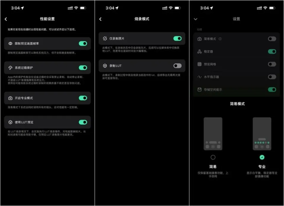 在设置界面中,飓风相机提供了诸多实用的选项,比如说性能设置内的限制预览画面帧率、系统过载保护、使用 LUT 预览等,可以显著提升飓风相机的流畅度;在烧录模式中,我们也可以自由选择仅录制原片或者录制 LUT。