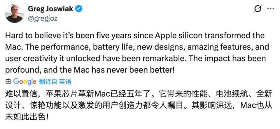 苹果全球市场营销高级副总裁 Greg Joswiak 今日在社交媒体上发文,纪念 Apple Silicon 芯片诞生五周年。自 2020 年 11 月首批搭载 M1 芯片的 Mac 发布至今,时间已经过去五年。